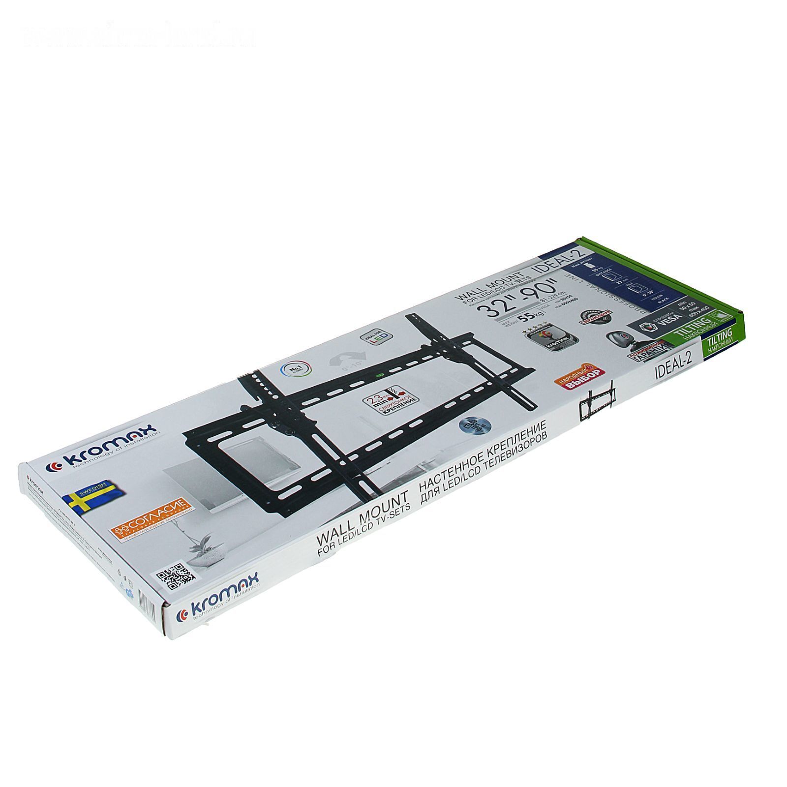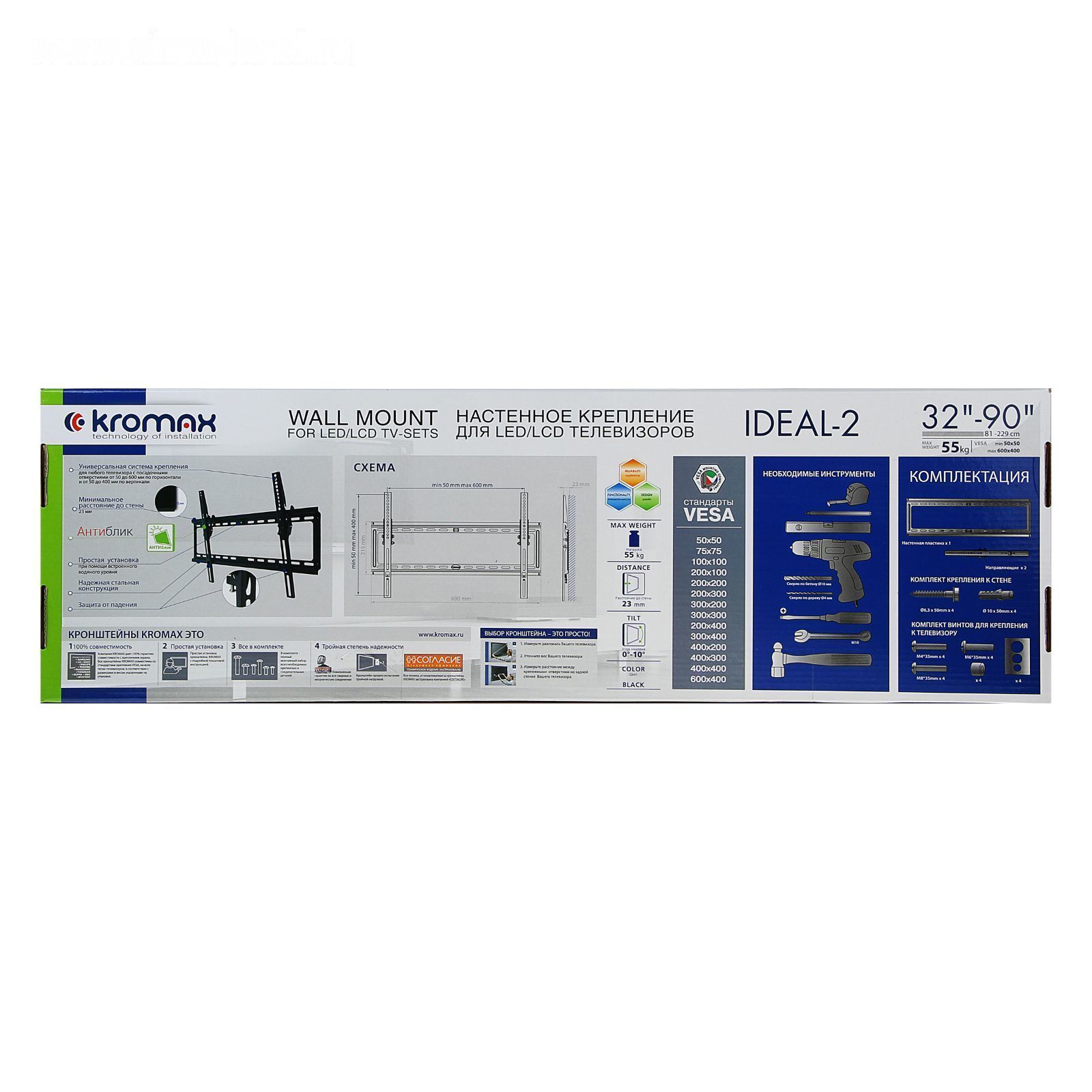 Кронштейн Kromax IDEAL-2 предназначен для крепления на стену LED-, LCD- и плазменных телевизоров с диагональю экрана от 32 до 90 дюймов и максимальным весом 55 кг. Ультратонкая прочная конструкция позволит расположить ТВ очень близко к стене (на расстоянии всего 23 мм). Наклонный механизм даёт возможность наклонить экран вниз до 10°, чтобы убрать солнечные блики и отражения освещения.