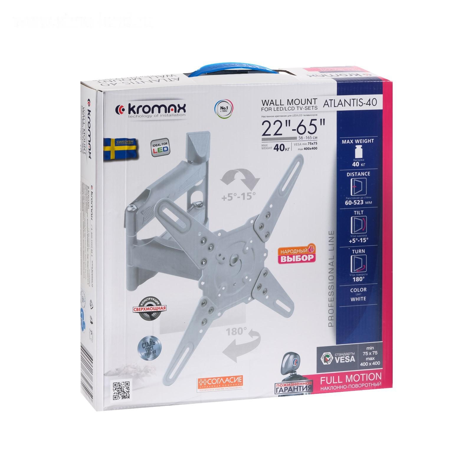 Кронштейн Kromax ATLANTIS-40, для ТВ, наклонно-поворотный, 22-65", 60-523 мм от стены, белый