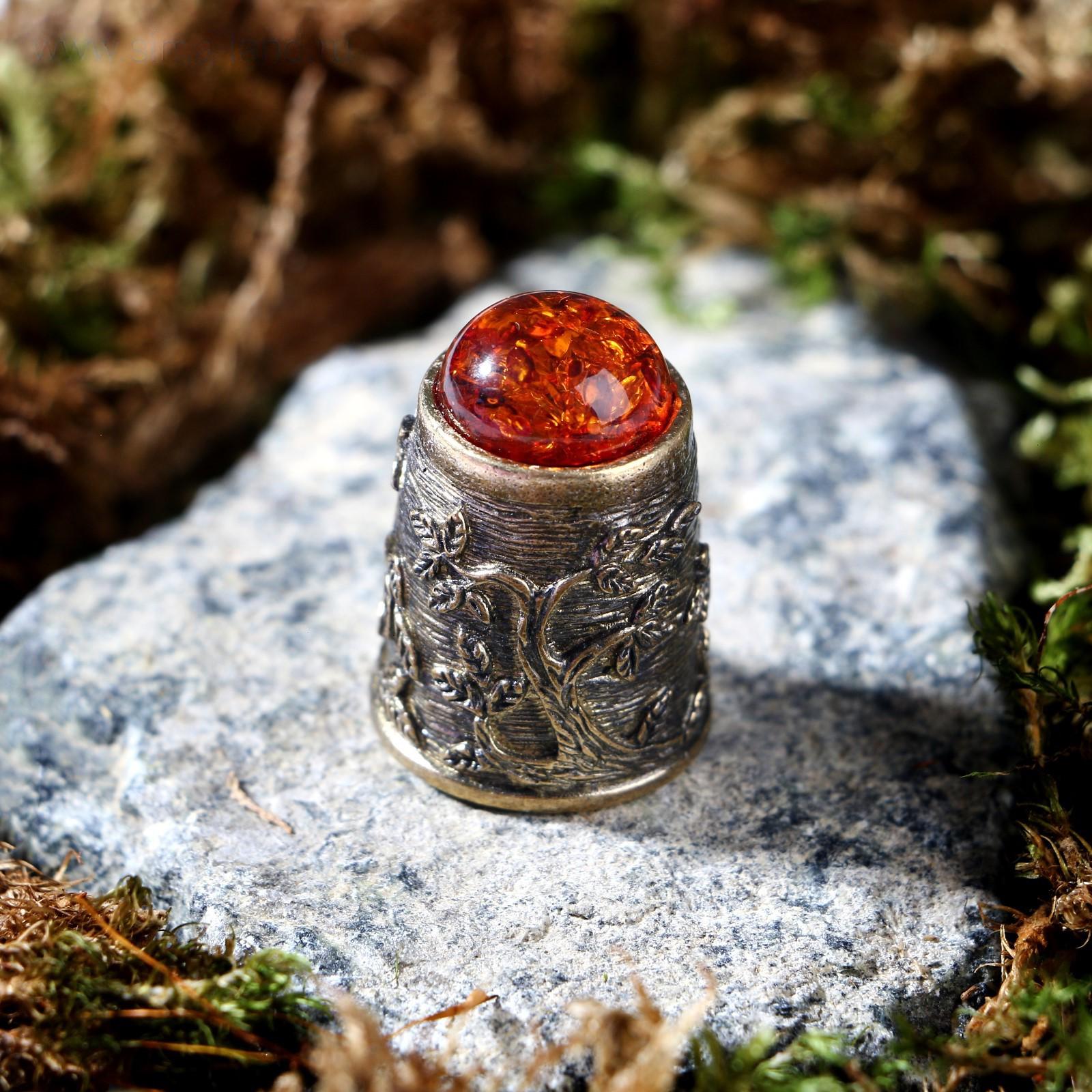 Напёрсток из латуни и янтаря "Сова в лесу", с кабошоном