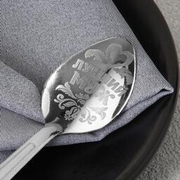 Ложка с лазерной гравировкой и изящной рукояткой преподносится на красочной открытке. На оборотной стороне изделия специально отведено место для подписи: кому и от кого был вручён подарок.