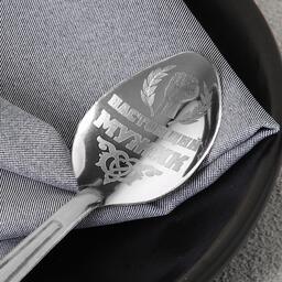 Ложка с лазерной гравировкой и изящной рукояткой преподносится на красочной открытке. На оборотной стороне изделия специально отведено место для подписи: кому и от кого был вручён подарок.