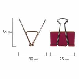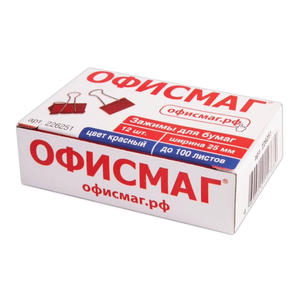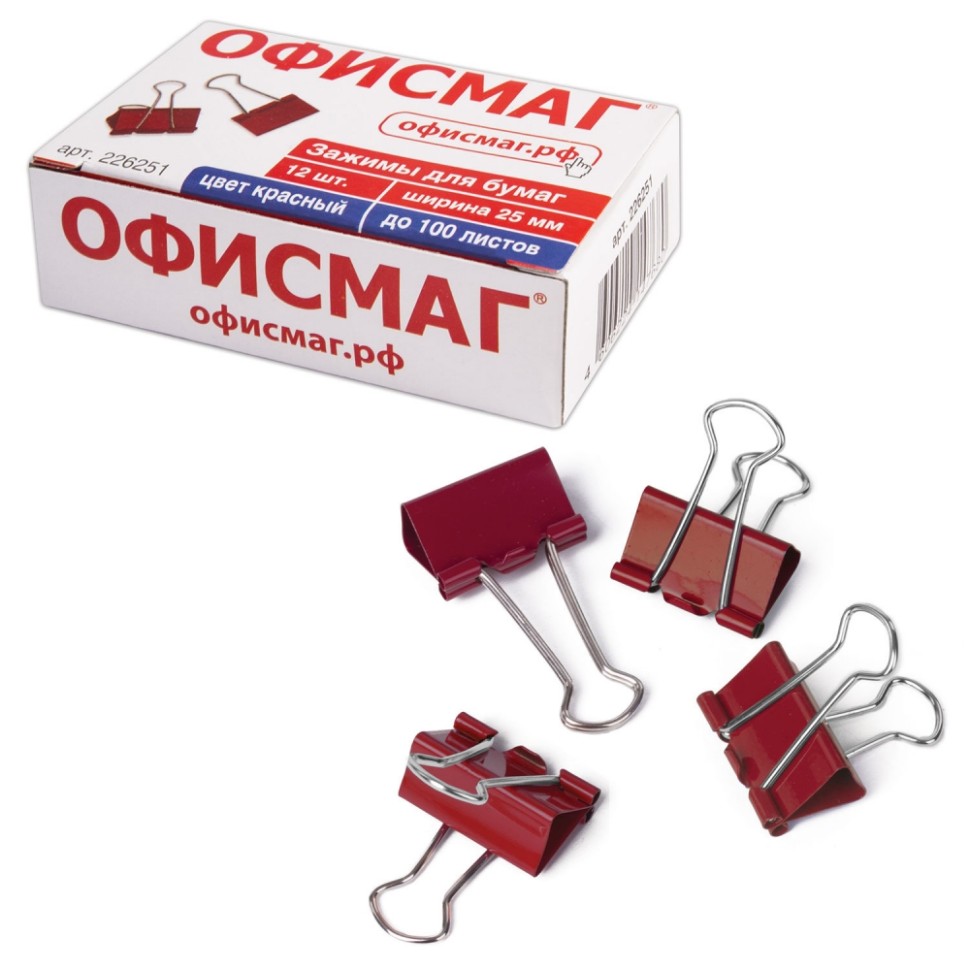Зажимы для бумаги – приспособления, позволяющие скрепить документы без нарушения их целостности. Для их изготовления используется как металл, так и пластик. Зажимы для бумаг предназначены для скрепления документов без использования степлера. Максимальное кол-во скрепляемых листов: 100. Тип зажима: классический. Ширина: 25 мм. Цвет: красный. Количество в упаковке: 12 шт.. Тип упаковки: картонная коробка Бренд - ОФИСМАГ. Производитель - Китай. Артикул - 226251. Штрихкод - 4606224147680