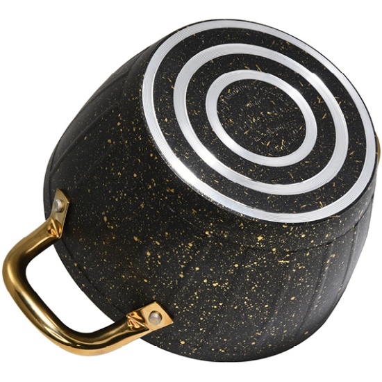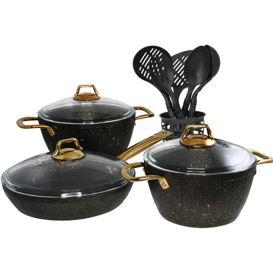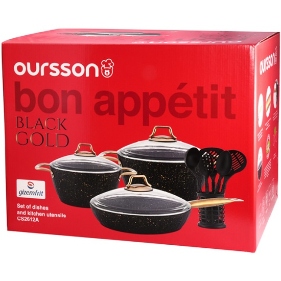 Набор посуды Oursson CS2612A/BL черныйНабор посуды серии Black Gold изготовлен из качественного алюминия с антипригарным 3-х слойным покрытием GIZEM FRIT. Антипригарное покрытие как с внутренней, так и с внешней стороны обеспечивает легкий уход, пища не пригорает, и посуда легко моется. Набор состоит из 2-х кастрюль с крышками объемом 2,8л и 4,3л, сковороды 26 см с крышкой и набора аксессуаров. Ручки всей посуды и крышек металлические, золотого цвета. Они имеют точечное соединение с алюминием заклепками. Ручка сковороды полая. Все это обеспечивает минимальный нагрев поверхностей ручек и их надежное соединение. Крышки всех предметов набора изготовлены из прочного стекла фирмы Pyrex. В набор аксессуаров входит лопатка с прорезями, ложка, вилка, шумовка, половник и подставка. Все аксессуары выполнены из термостойкого пищевого пластика. Подставка имеет отверстия на дне, чтобы влага не скапливалась. <br />Посуда серии Black Gold подходит для всех типов плит, кроме индукционных. Ее можно мыть в посудомоечной машине. Набор упакован в яркую подарочную коробку Особенности: Количество в наборе, шт: 12Размеры изделий в наборе, мм: d200x105; d240x120; d260x50Подарочная упаковка: ДаПодходит для хранения в холодильнике: ДаВозможность мытья в посудомоечной машине: ДаСтрана производства: Турция