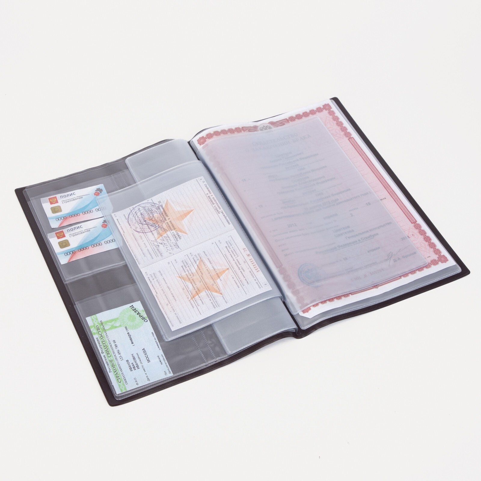 Страницы 3–6: 3 отдела для пластиковых карт размером 9 × 6 см и 1 отдел для страхового свидетельства размером 9 × 12 см.