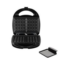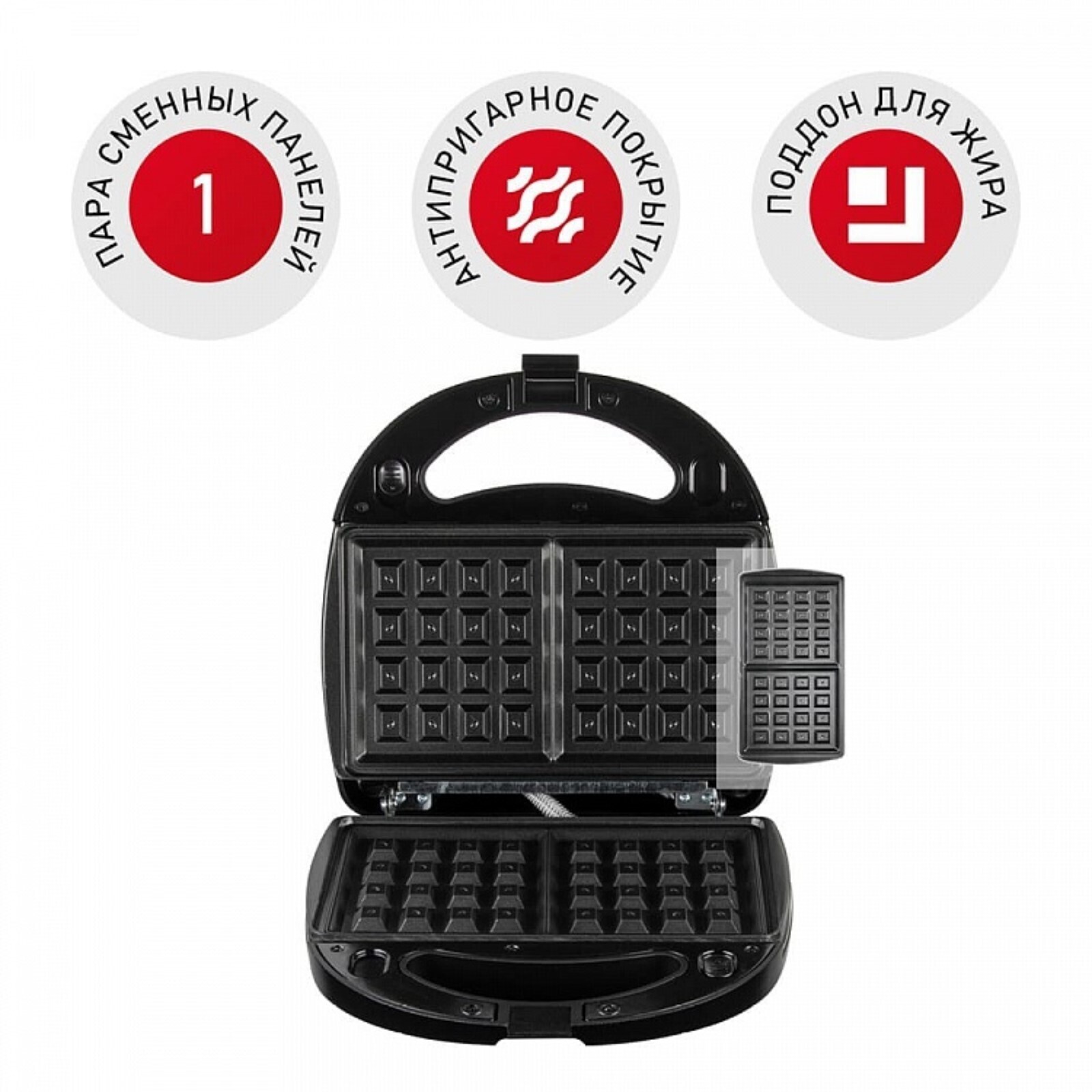 Корпус устройства изготовлен из лёгкого и жаропрочного пластика с металлическими вставками. Панели выполнены из прочного металла, долговечны и просты в уходе. Благодаря антипригарному покрытию готовить в мультипекаре можно с минимальным количеством масла или совсем без него. Блюда не пригорают и легко извлекаются. На формах предусмотрены удобные ручки, благодаря которым панель из прибора легко вынимать.
