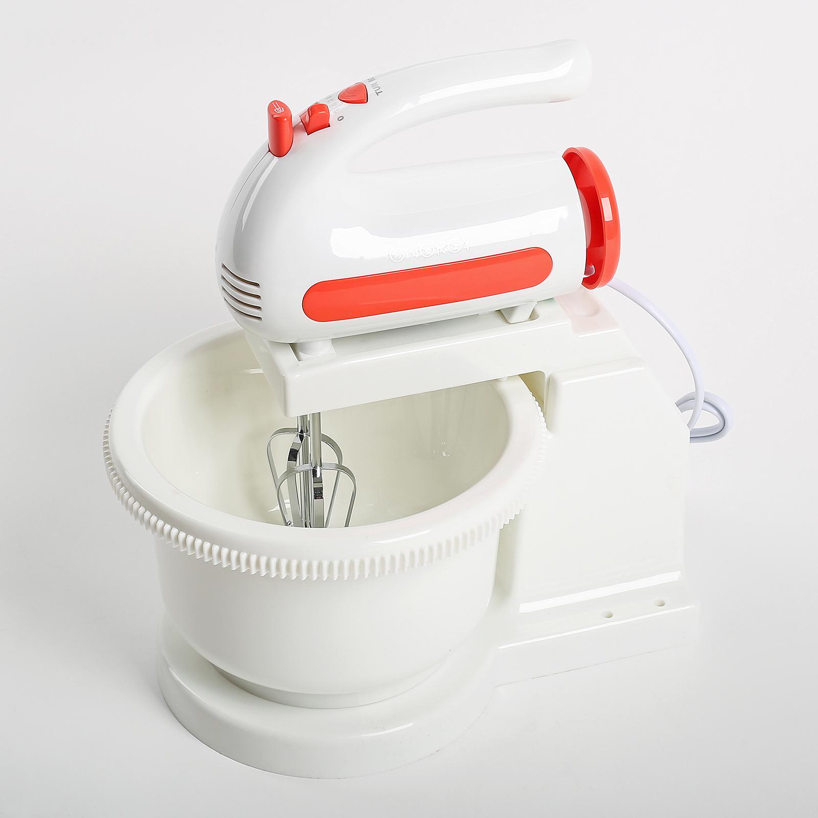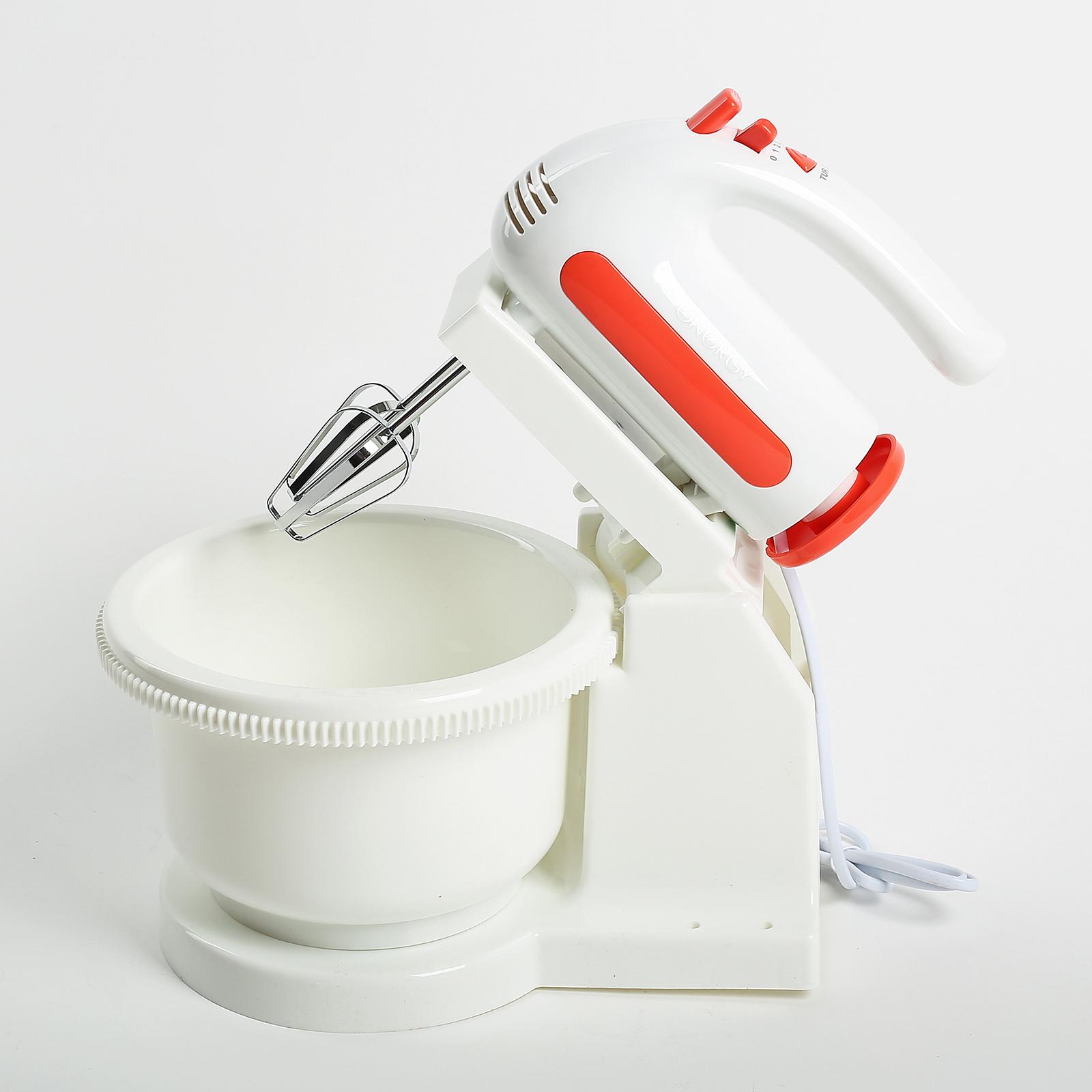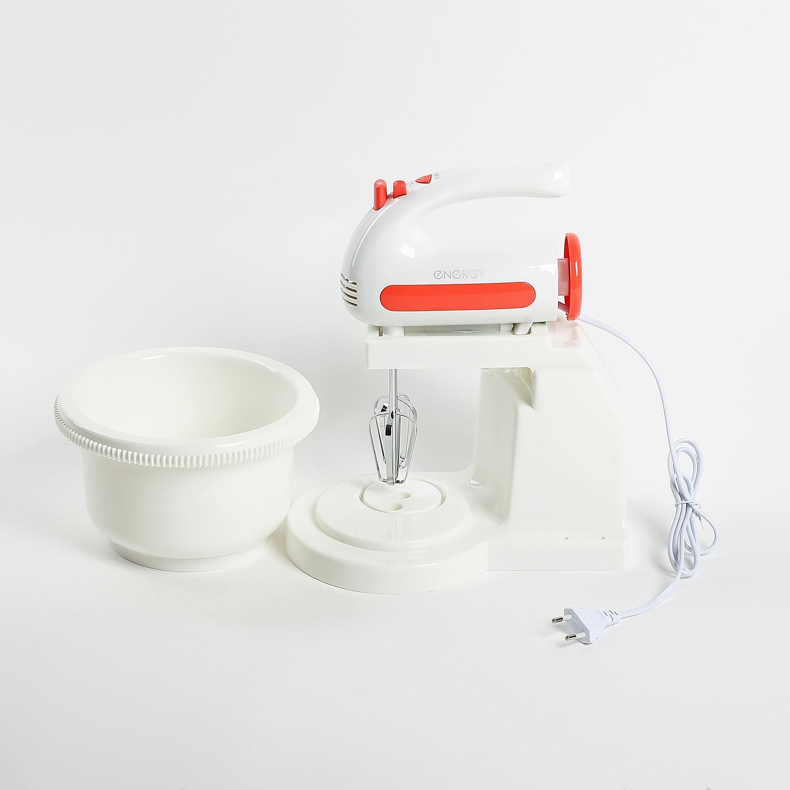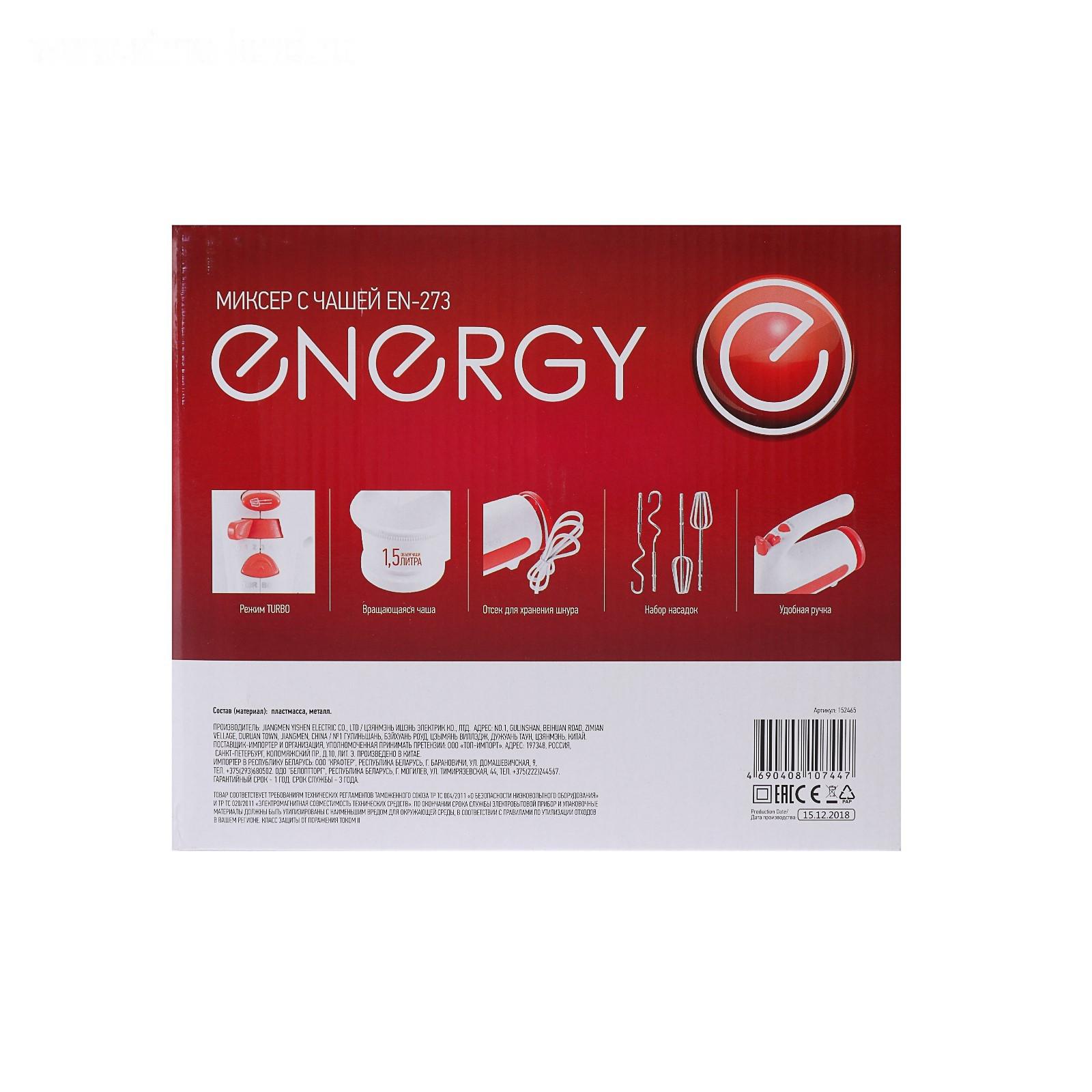 ENERGY EN-273 — стационарный миксер. В комплект с прибором входит вращающаяся чаша объёмом 1,5 л, стальные венчики для взбивания и насадки для замешивания теста. Доступны 5 скоростных режимов, включая турбо. Прибор работает от сети.