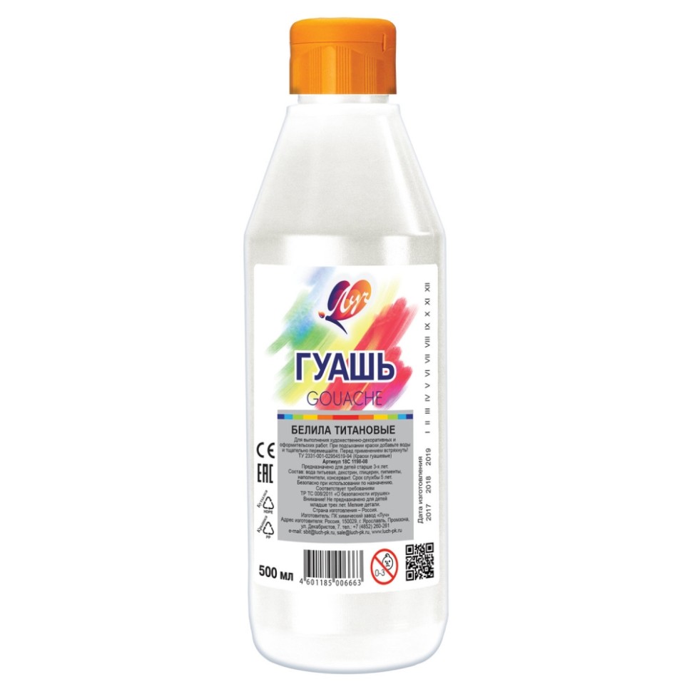 Гуашь обладает превосходной кроющей способностью, насыщенностью и чистотой цвета, равномерно наносится. После высыхания краски поверхность становится матово-бархатистой. Специальная крышка для контроля дозировки краски. Объем баночки: 500 мл. Масса: 830 г. Цвет: белила титановые. Количество цветов: 1 шт.. Крышка-дозатор: да. Тара: пластиковая бутылка Бренд - ЛУЧ. Производитель - Россия. Артикул - 18С 1198-08. Штрихкод - 4601185006663