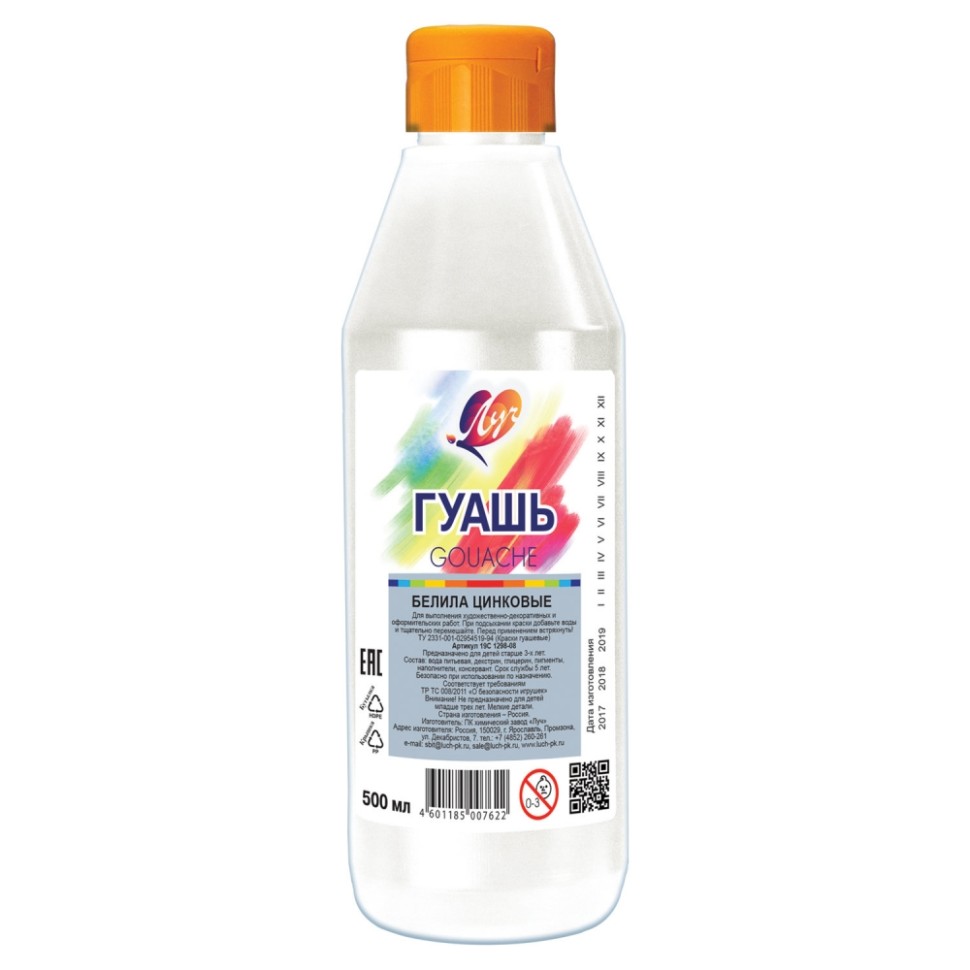Гуашь обладает превосходной кроющей способностью, насыщенностью и чистотой цвета, равномерно наносится. После высыхания краски поверхность становится матово-бархатистой. Специальная крышка для контроля дозировки краски. Объем баночки: 500 мл. Масса: 850 г. Цвет: белила цинковые. Количество цветов: 1 шт.. Крышка-дозатор: да. Тара: пластиковая бутылка Бренд - ЛУЧ. Производитель - Россия. Артикул - 19С 1298-08. Штрихкод - 4601185007622