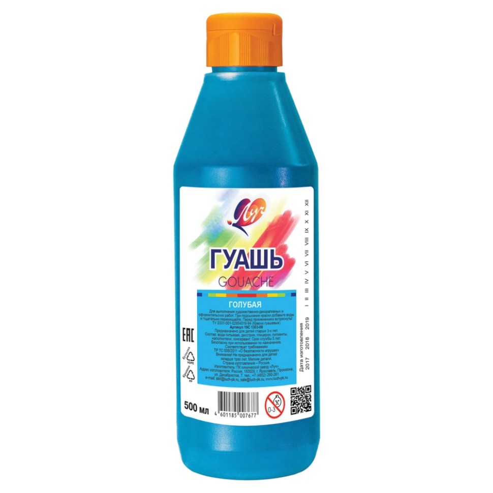 Гуашь обладает превосходной кроющей способностью, насыщенностью и чистотой цвета, равномерно наносится. После высыхания краски поверхность становится матово-бархатистой. Специальная крышка для контроля дозировки краски. Объем баночки: 500 мл. Масса: 670 г. Цвет: голубой. Количество цветов: 1 шт.. Крышка-дозатор: да. Тара: пластиковая бутылка Бренд - ЛУЧ. Производитель - Россия. Артикул - 19С 1303-08. Штрихкод - 4601185007677
