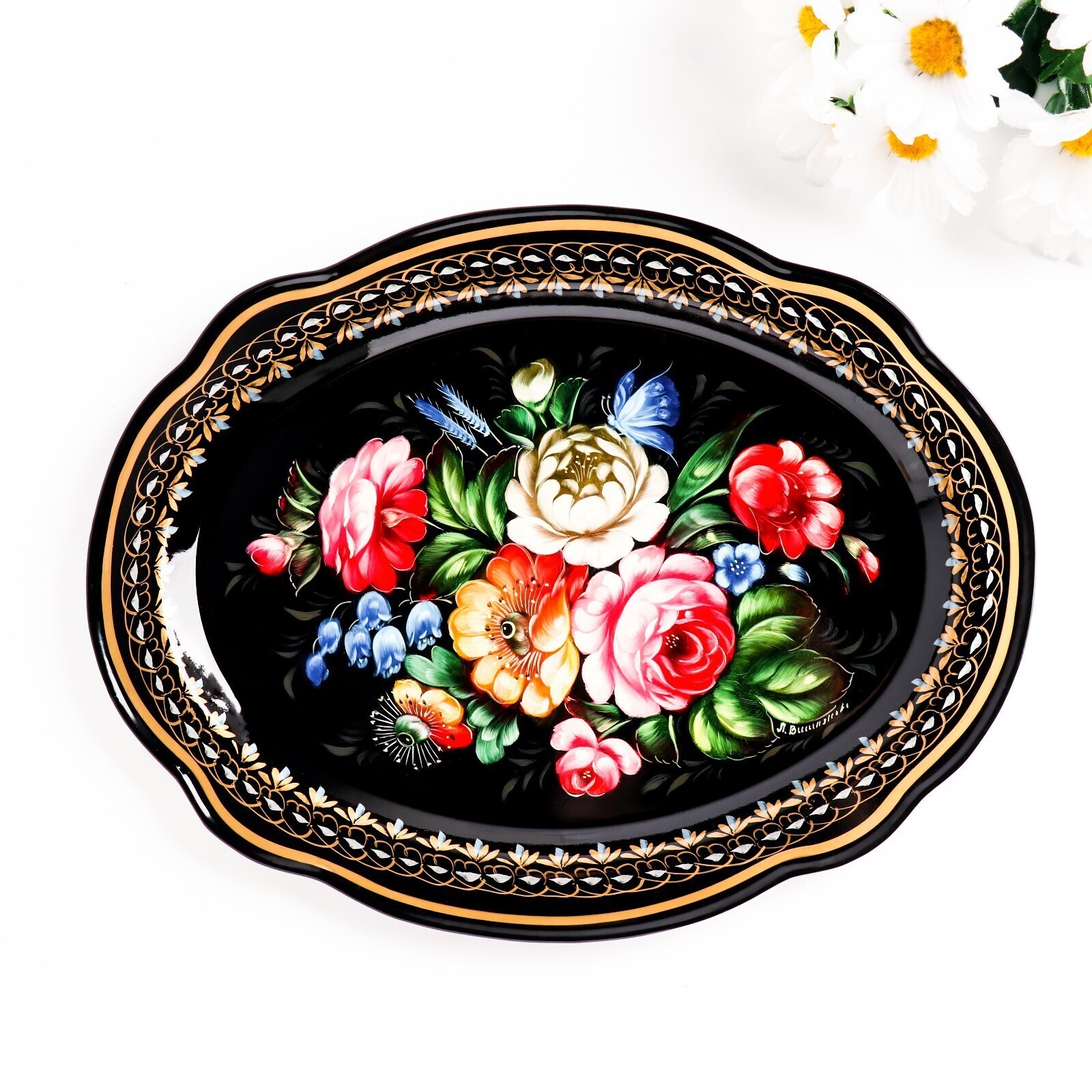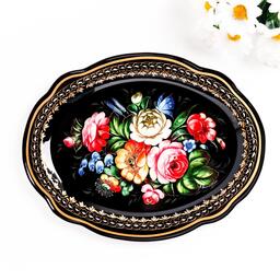 Поднос жостовский "Цветы", черный, с авторской росписью, 30х23 см