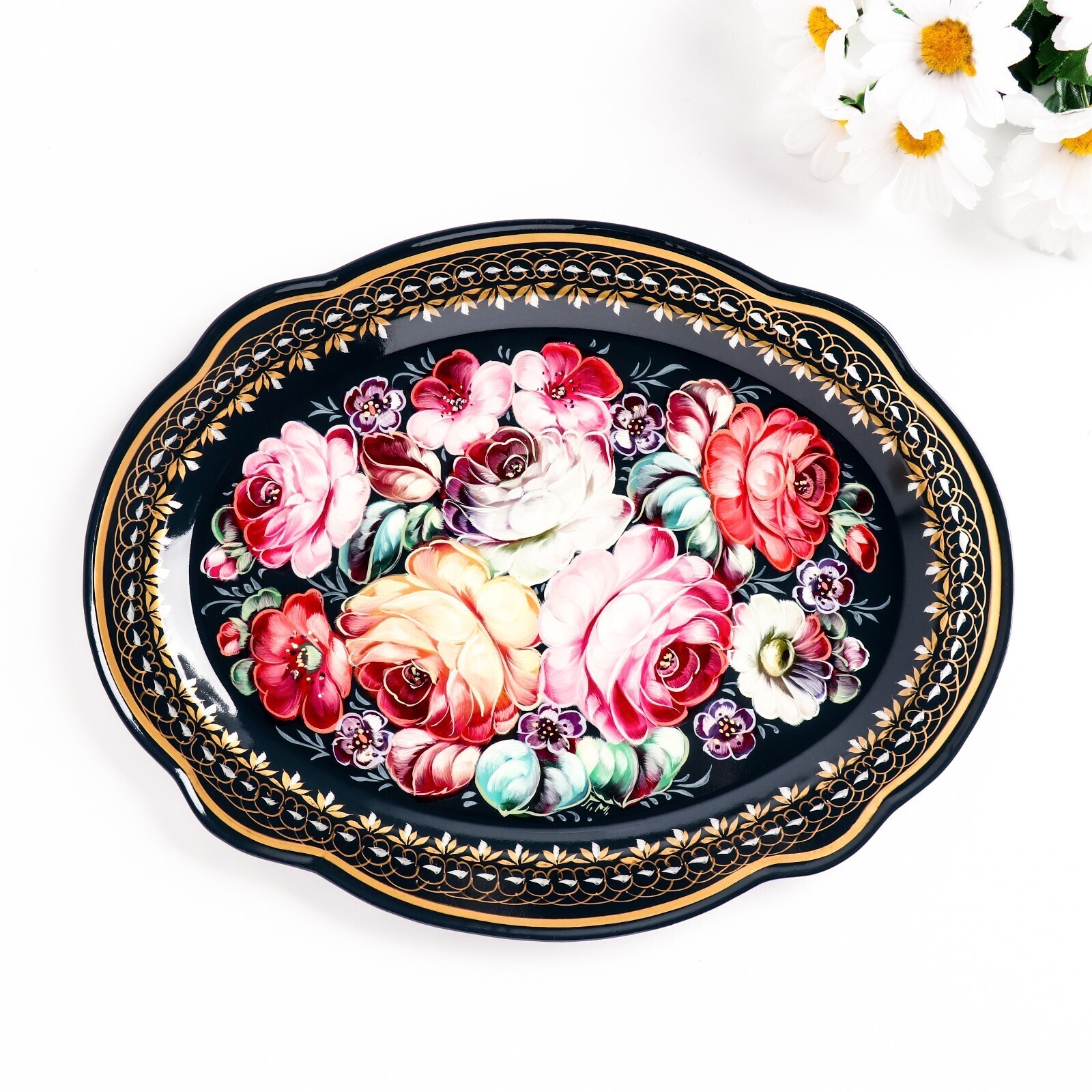 Поднос жостовский "Цветы", синий, с авторской росписью, 30х23 см