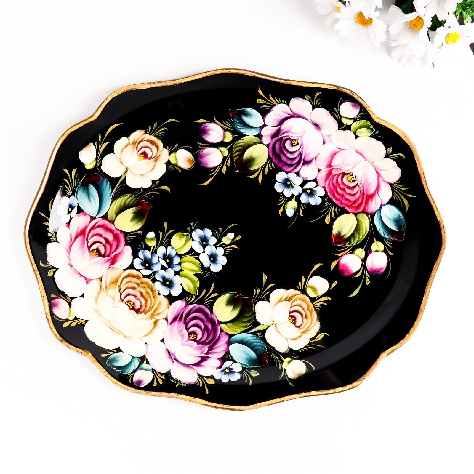 Поднос жостовский "Цветы", черный, с авторской росписью, 38х31 см