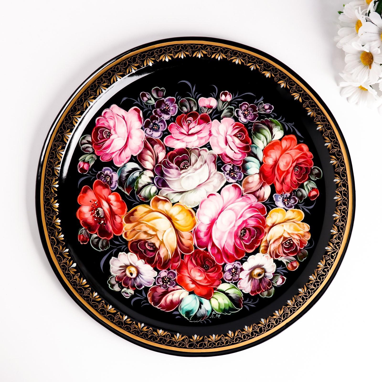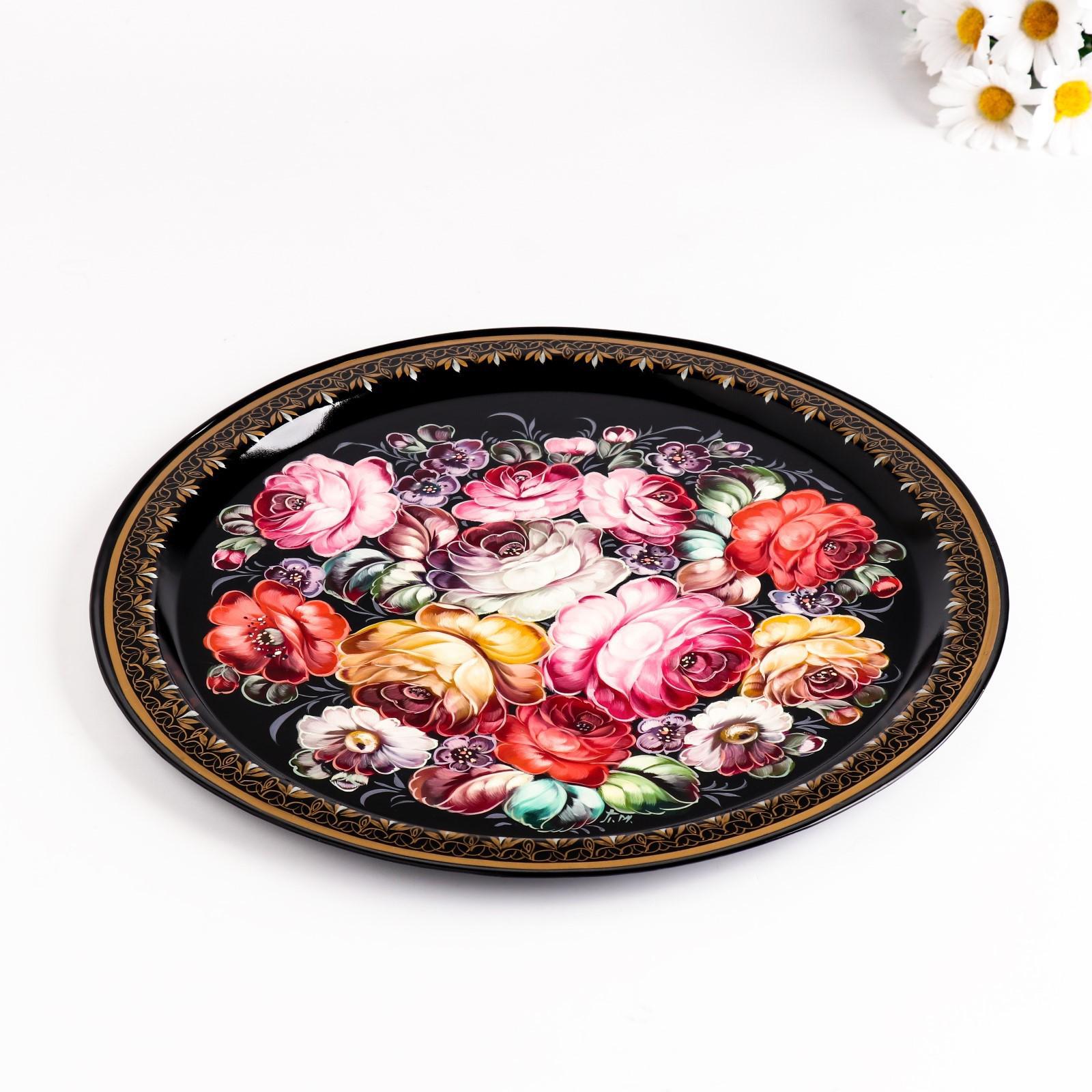 Поднос жостовский "Букет", черный, с авторской росписью D-34 см