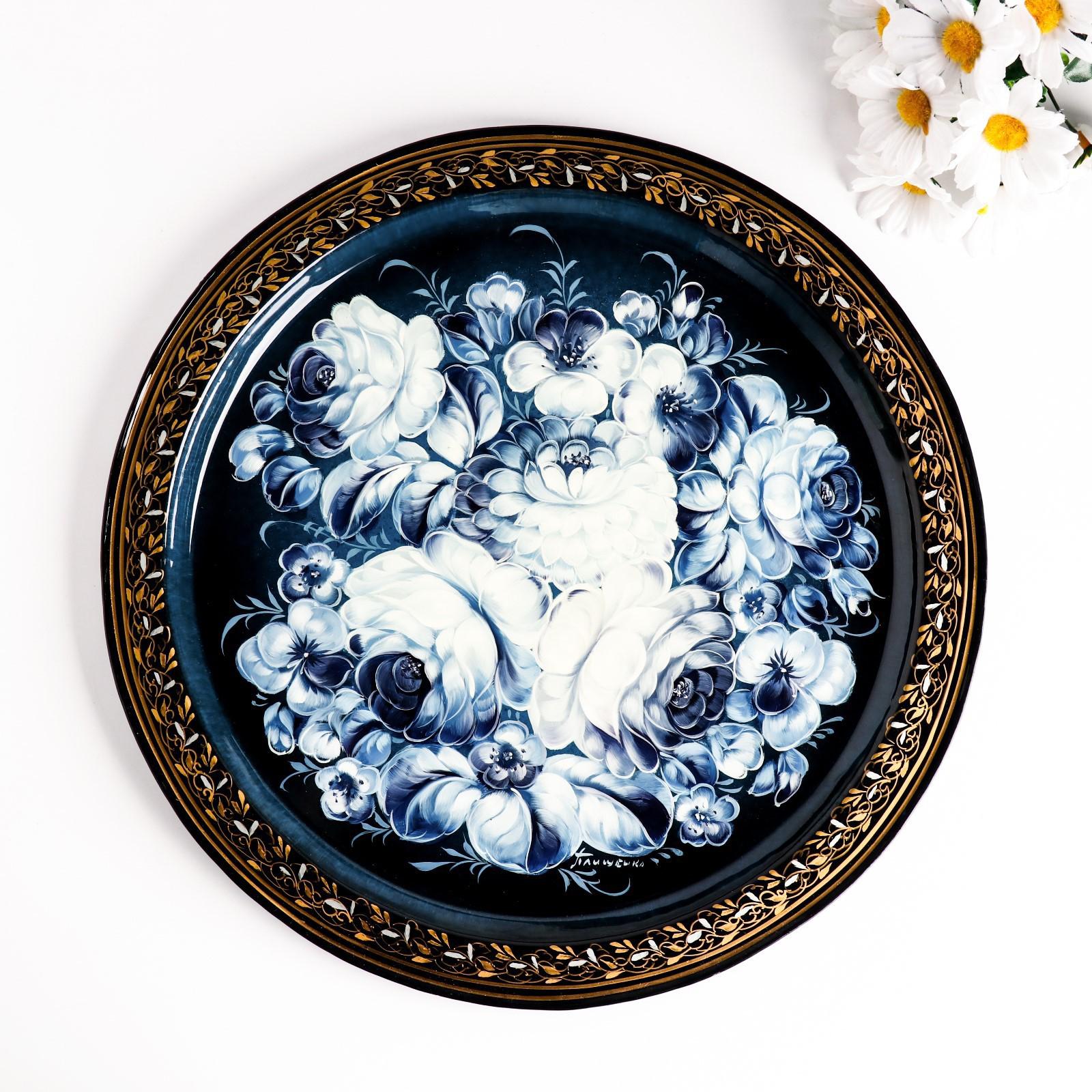 Поднос жостовский "Зимний букет", черный, с авторской росписью D-34 см