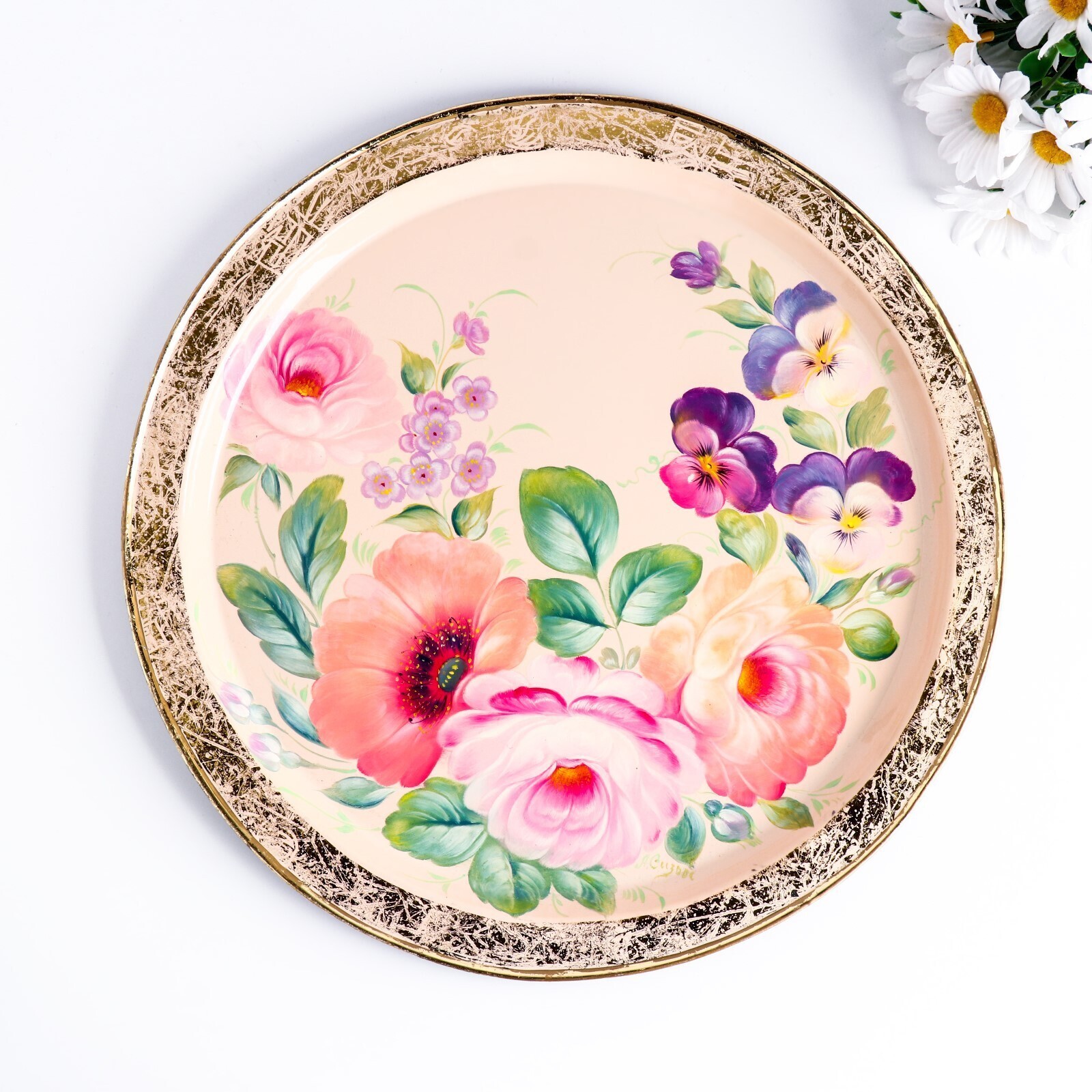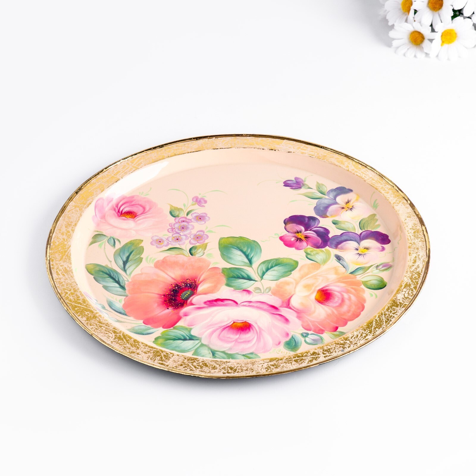 Поднос жостовский "Букет", бледно-розовый, с авторской росписью, D=34 см