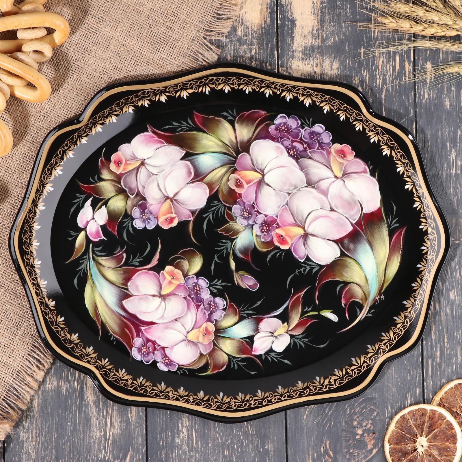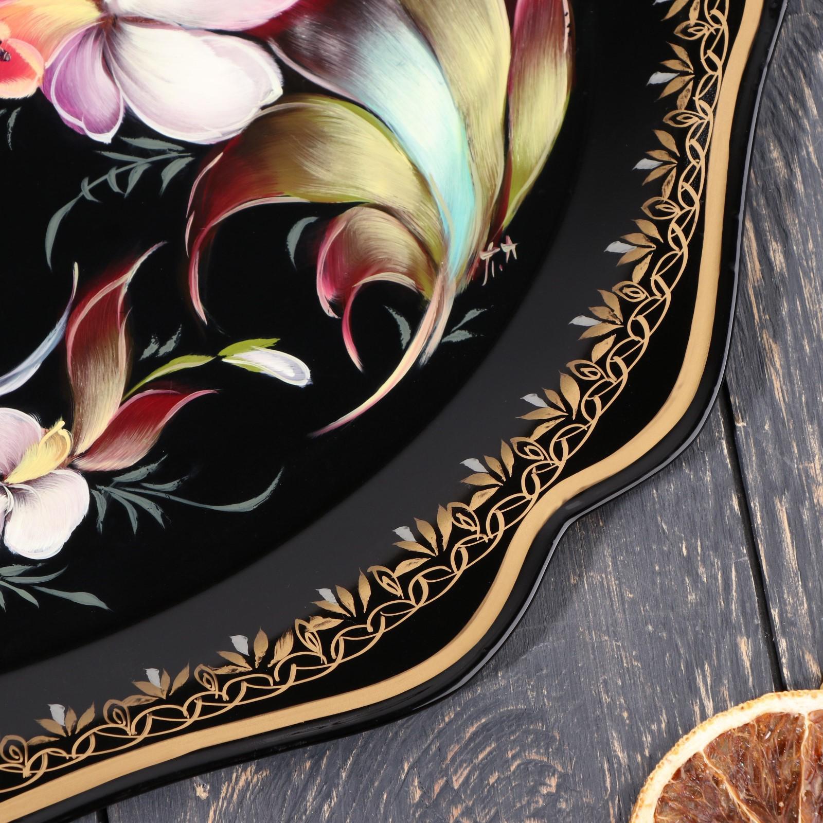 Поднос жостовский "Цветочная мечта", чёрный, авторская роспись, D - 34 см