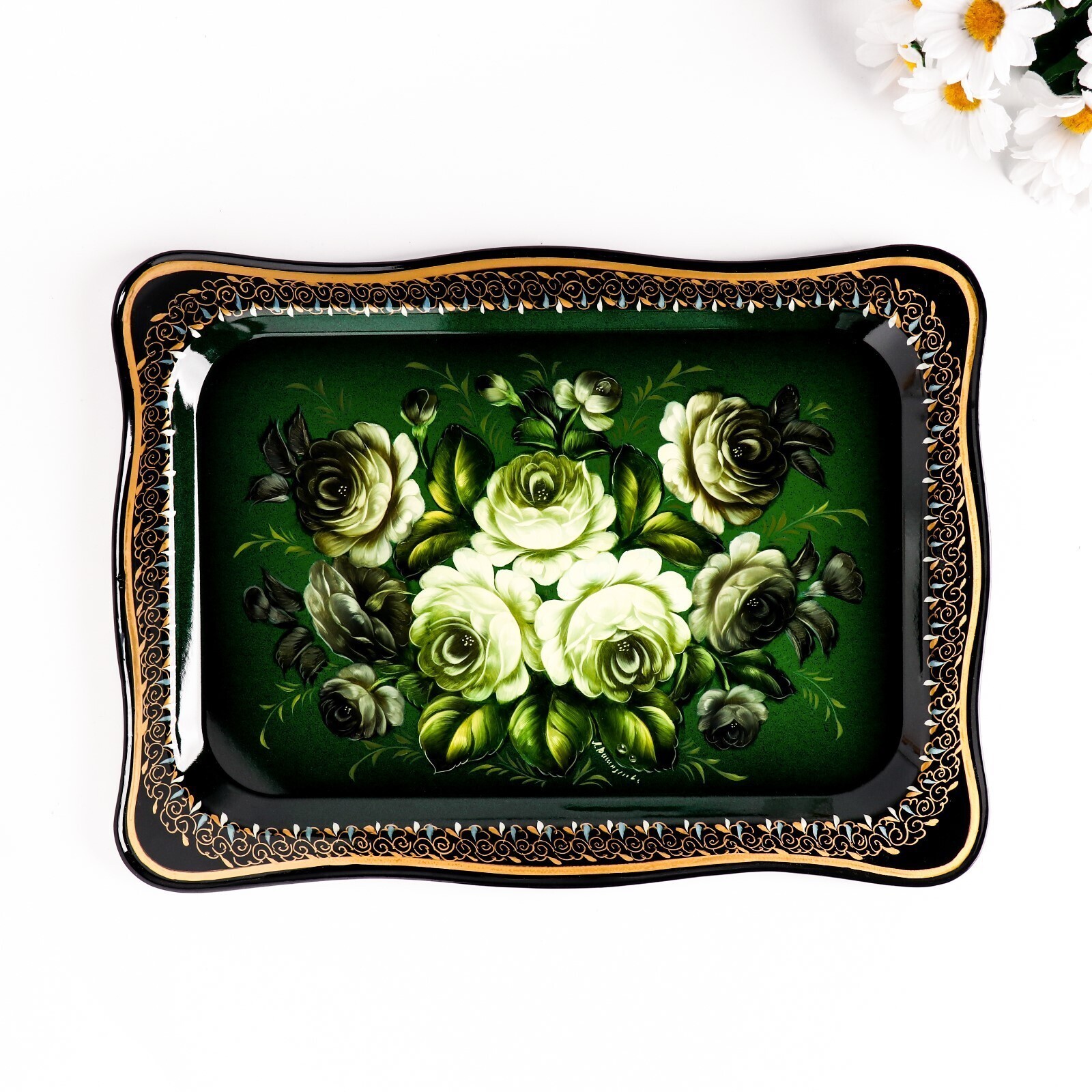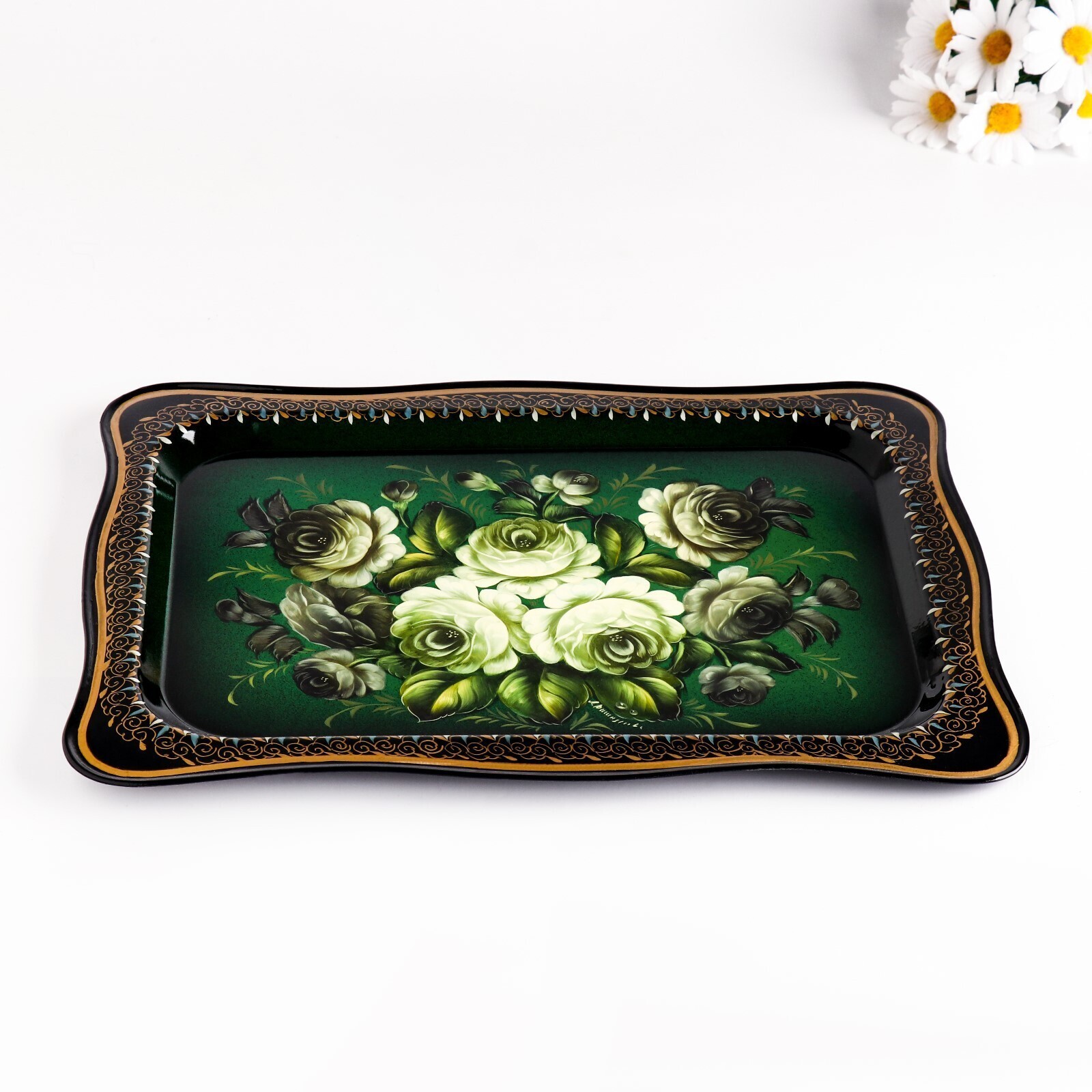 Поднос жостовский "Цветы белые", черный, с авторской росписью, 37х27 см