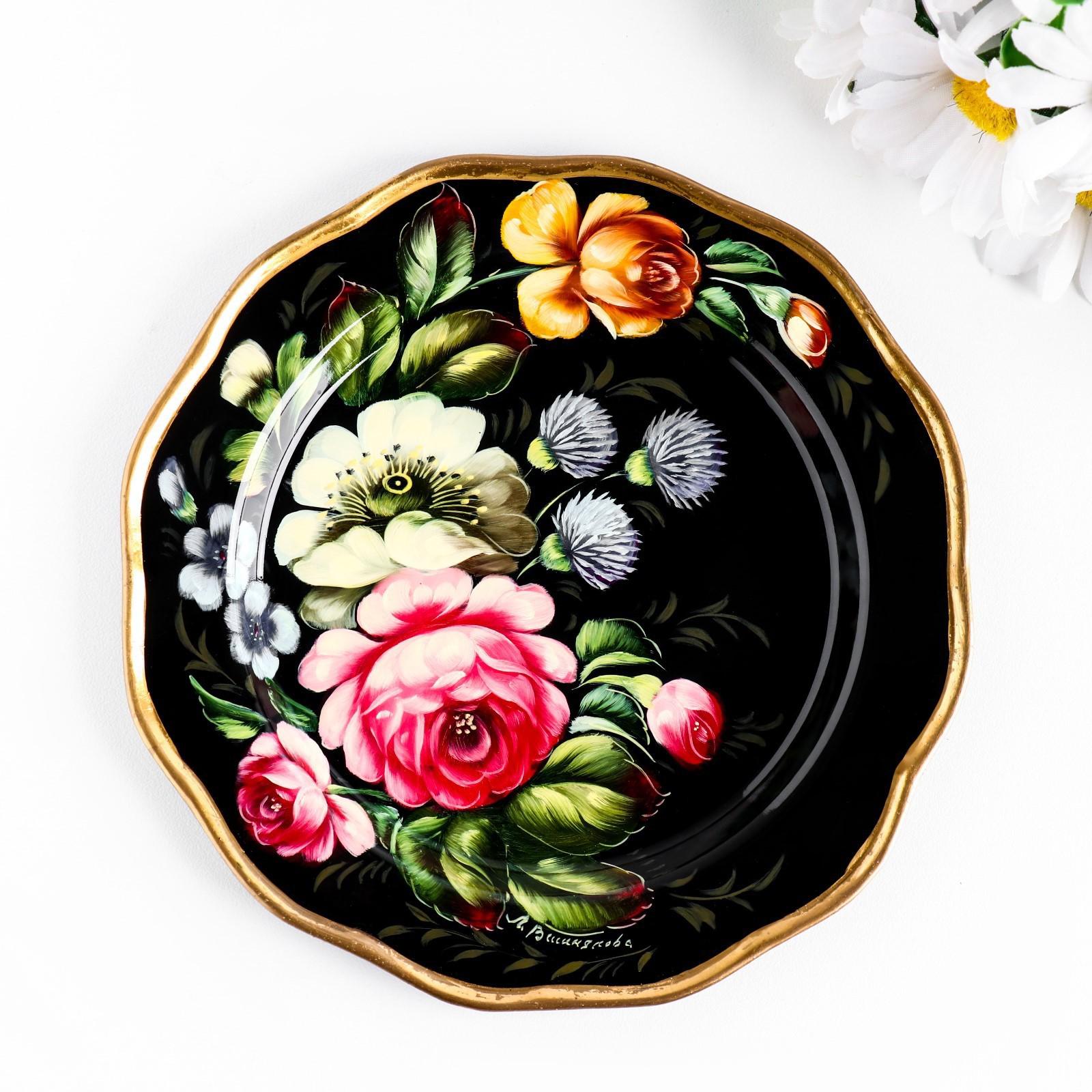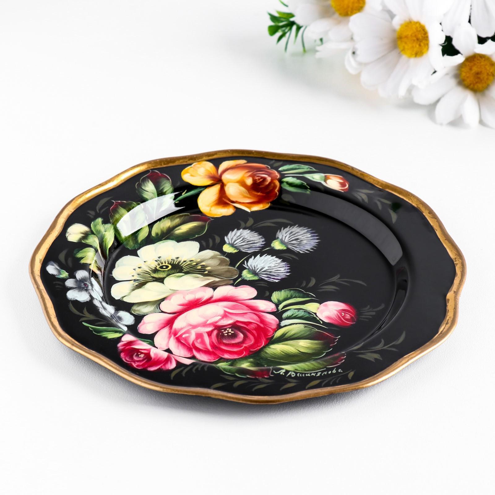 Поднос жостовский "Пионы", черный, с авторской росписью, D=17 см