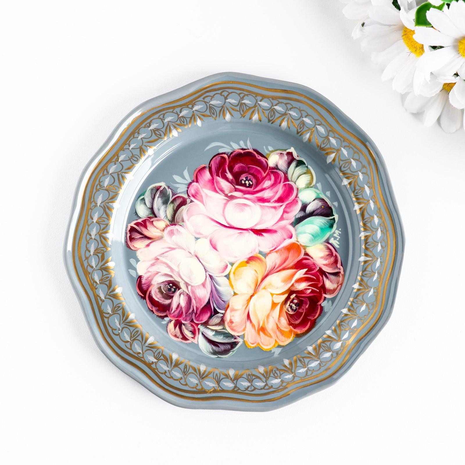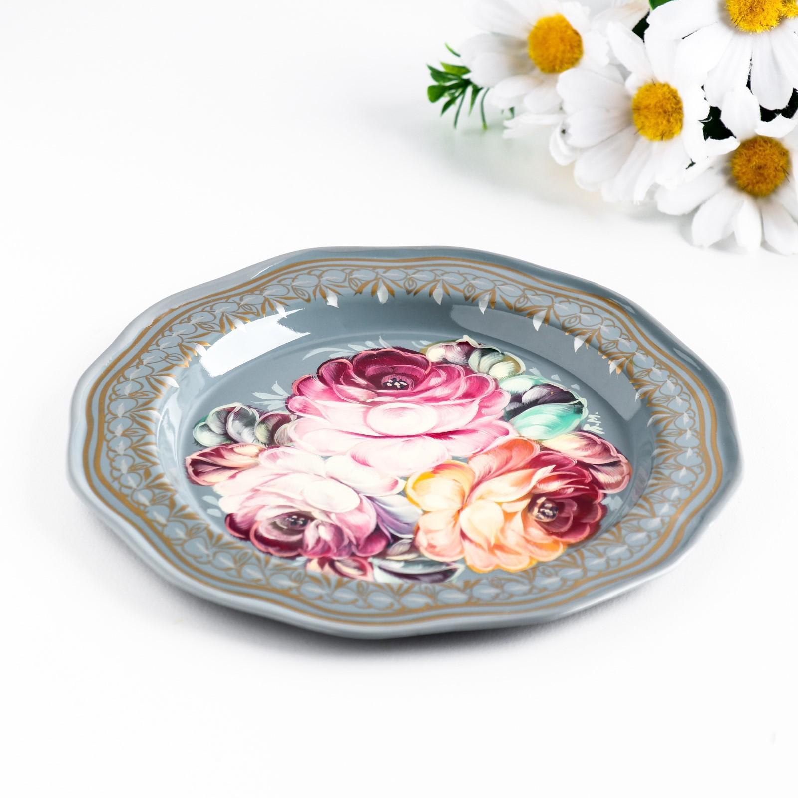 Поднос жостовский "Пионы", серый, с авторской росписью, D=17 см