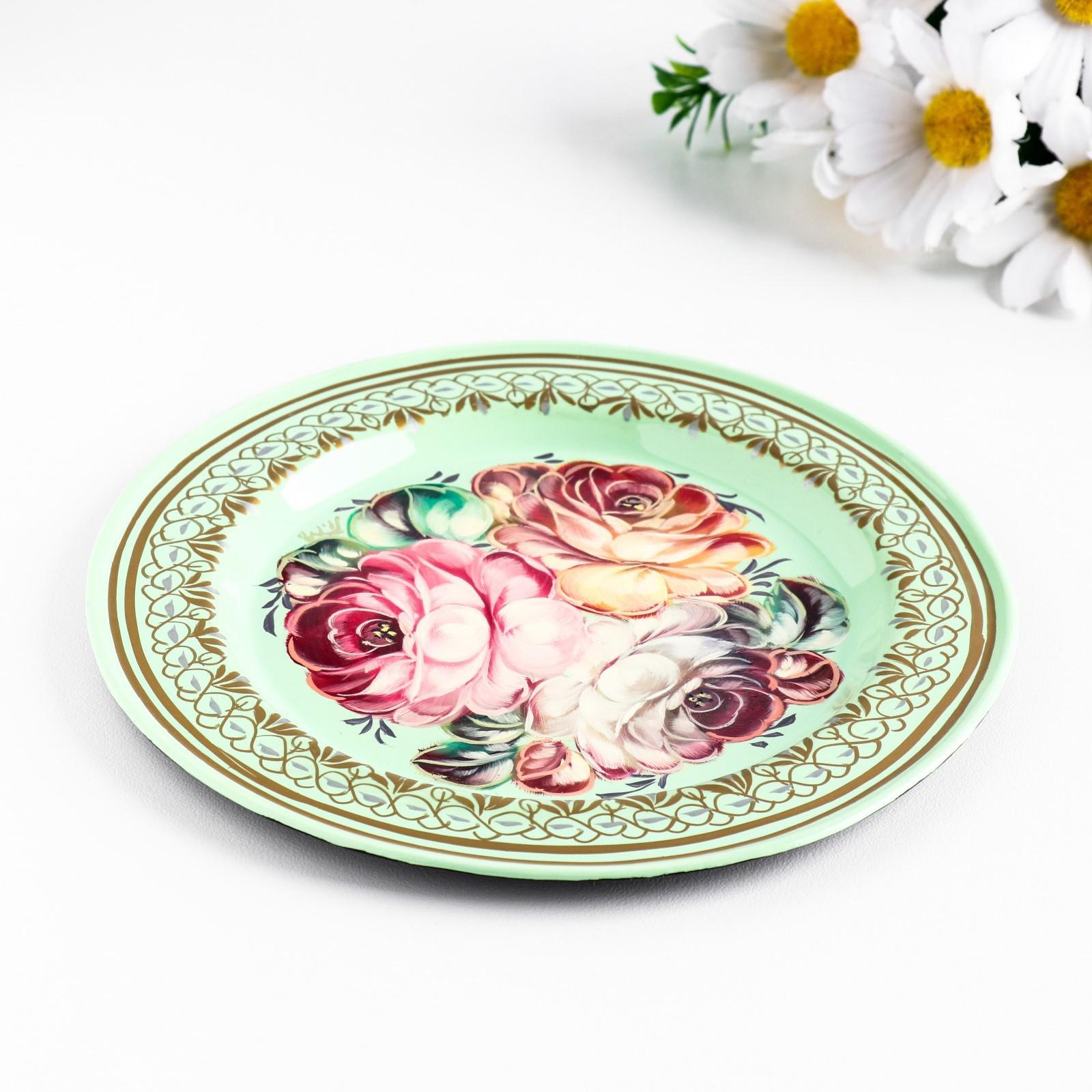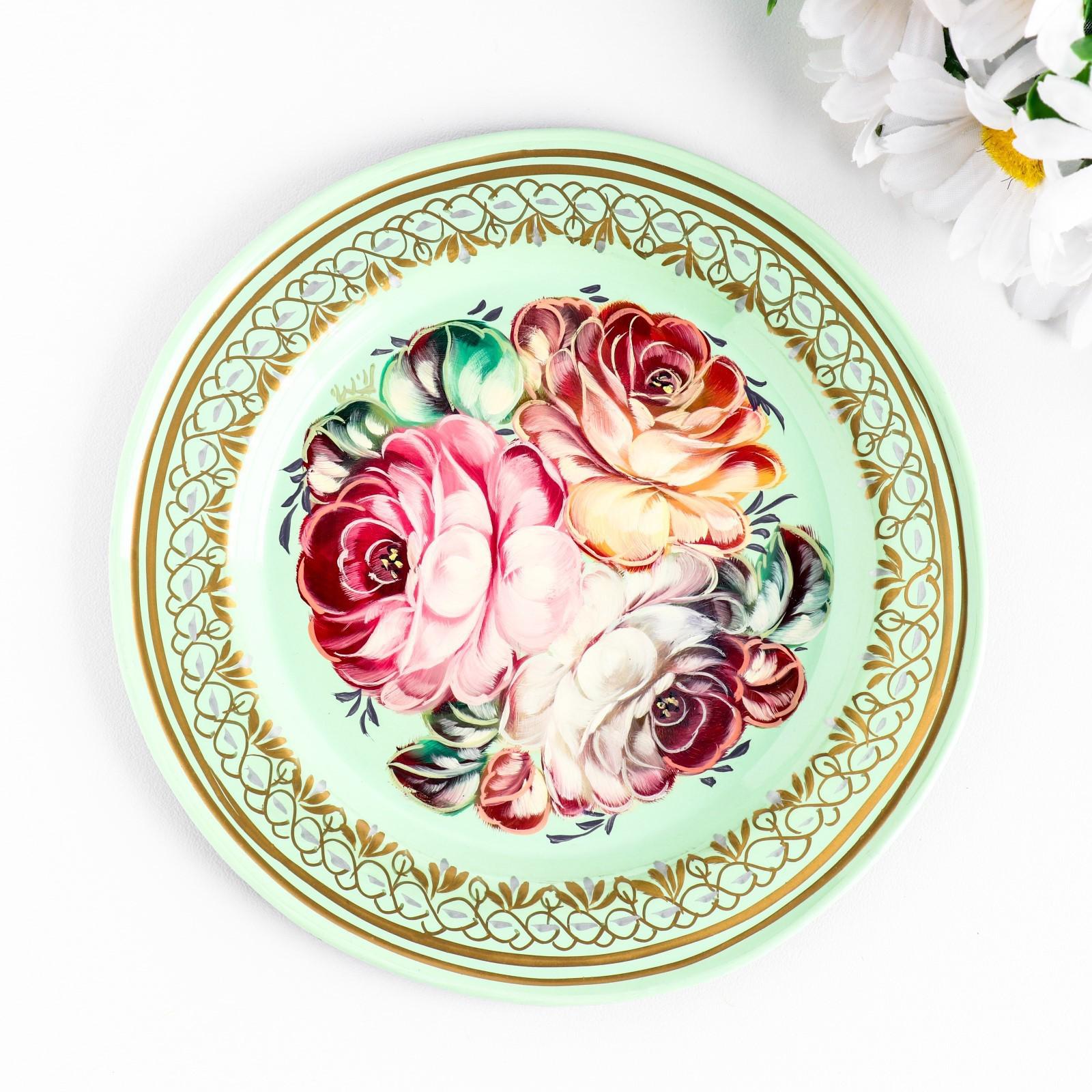 Поднос жостовский "Пионы", изумрудный, с авторской росписью, D=17 см