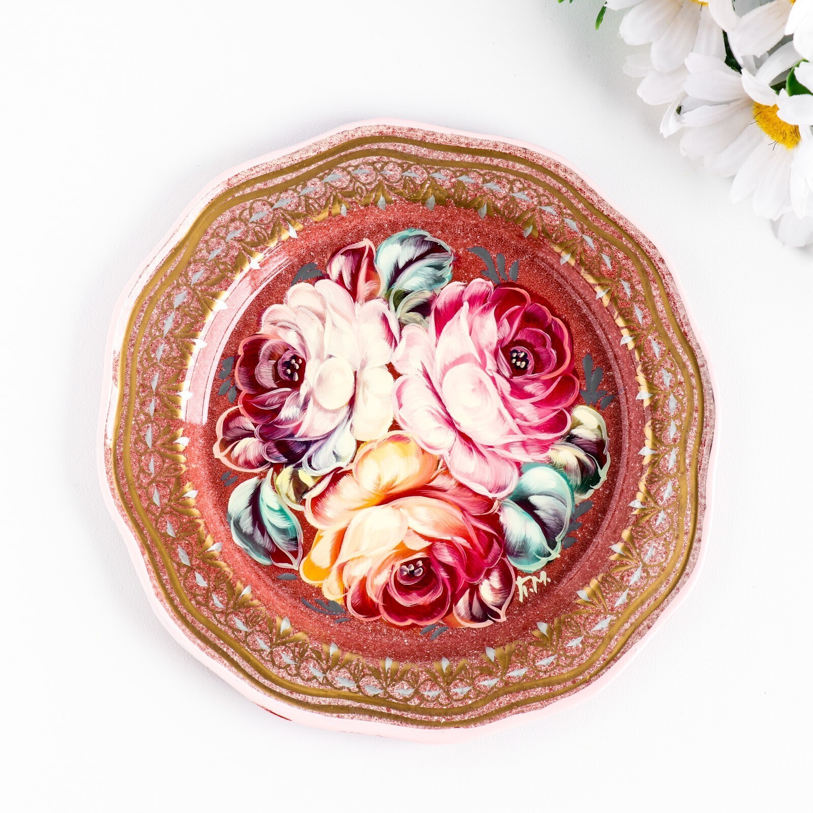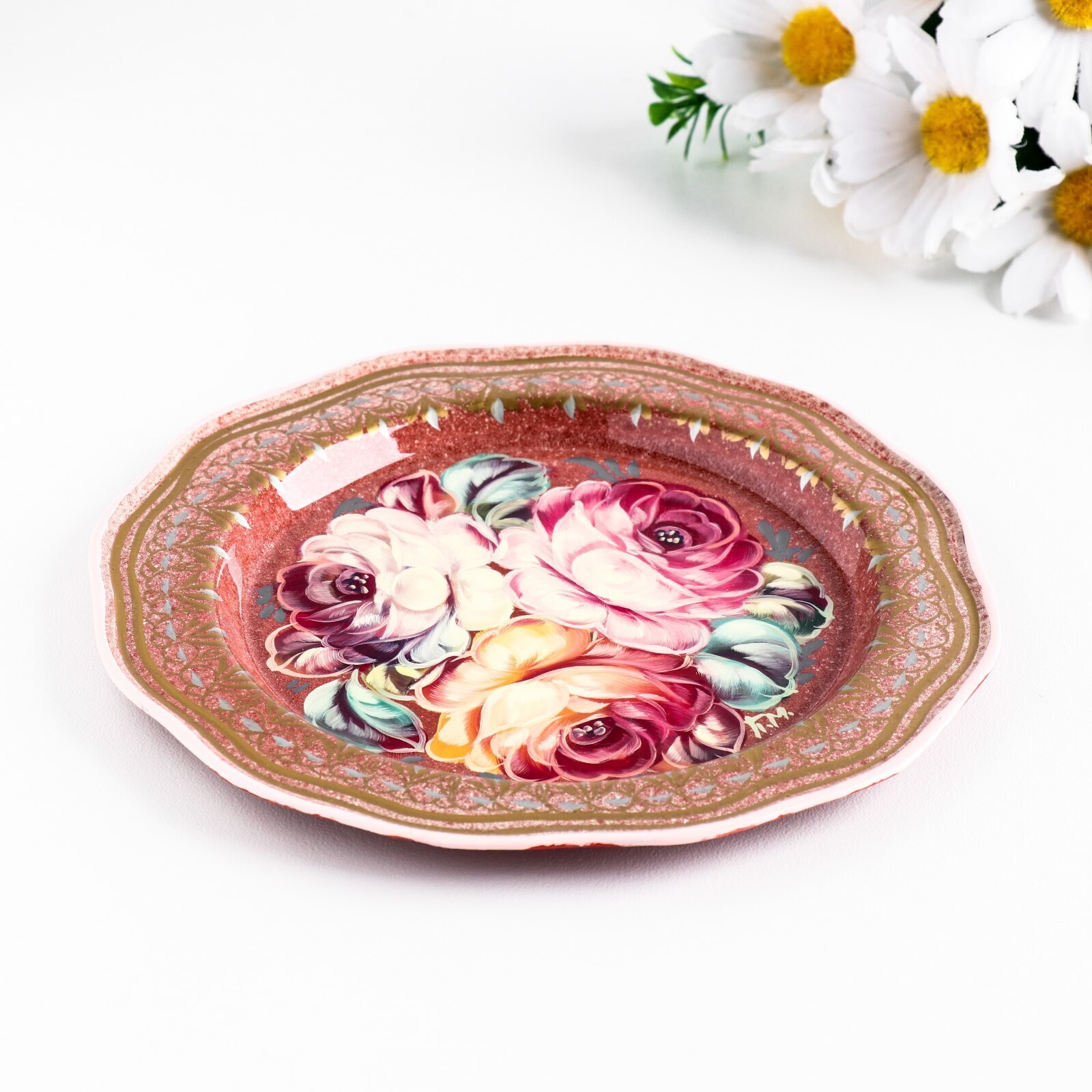 Поднос жостовский "Пионы", розовый, с авторской росписью, D=17 см