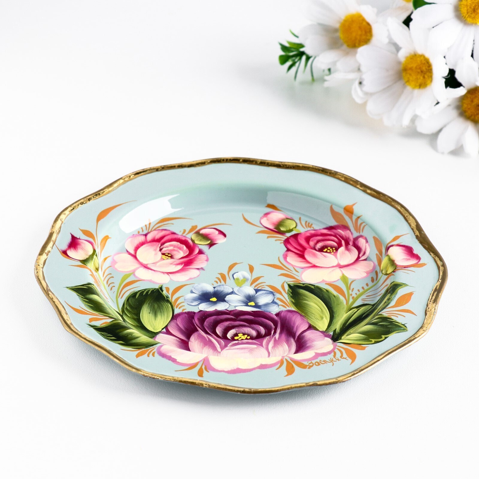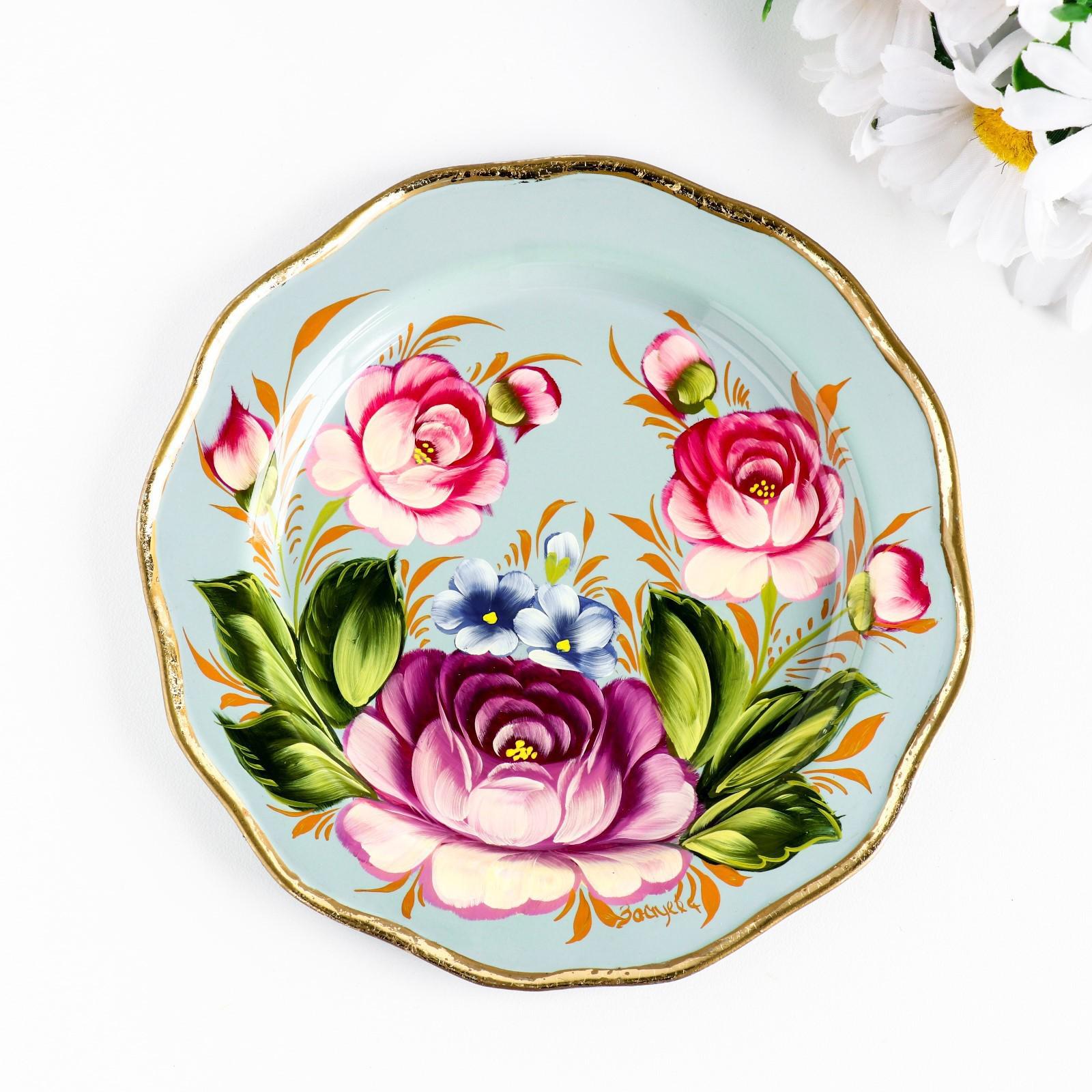 Поднос жостовский "Цветы", голубой, с авторской росписью, D=17 см