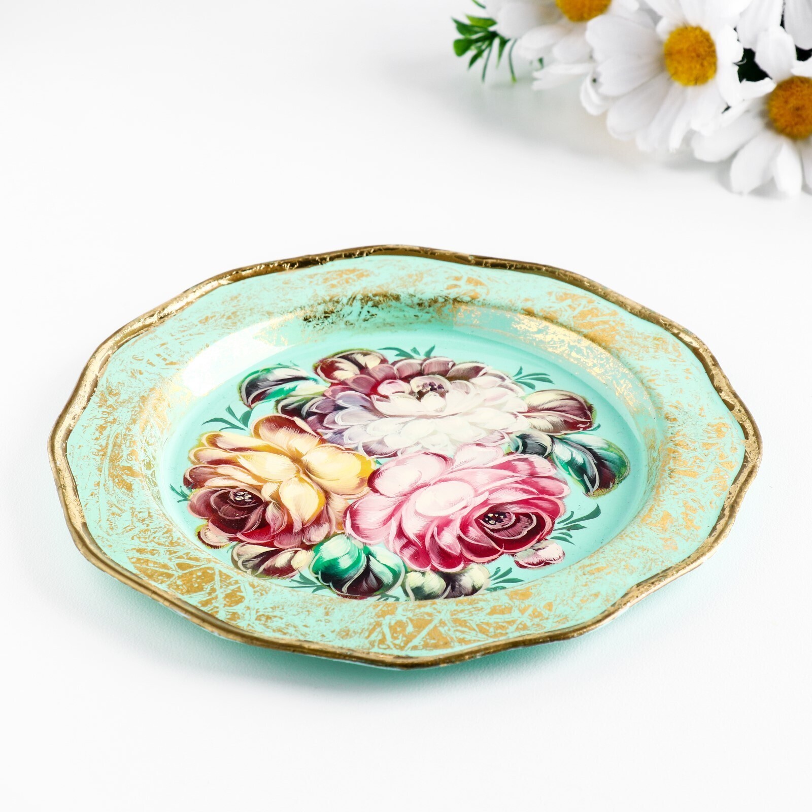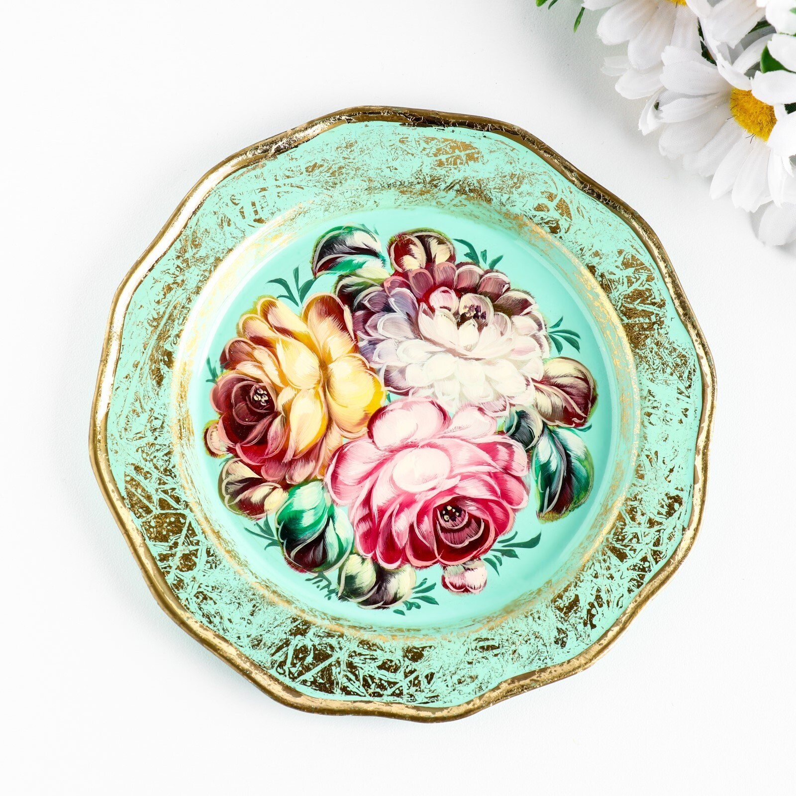 Поднос жостовский "Пионы", голубой, с авторской росписью, D=17 см