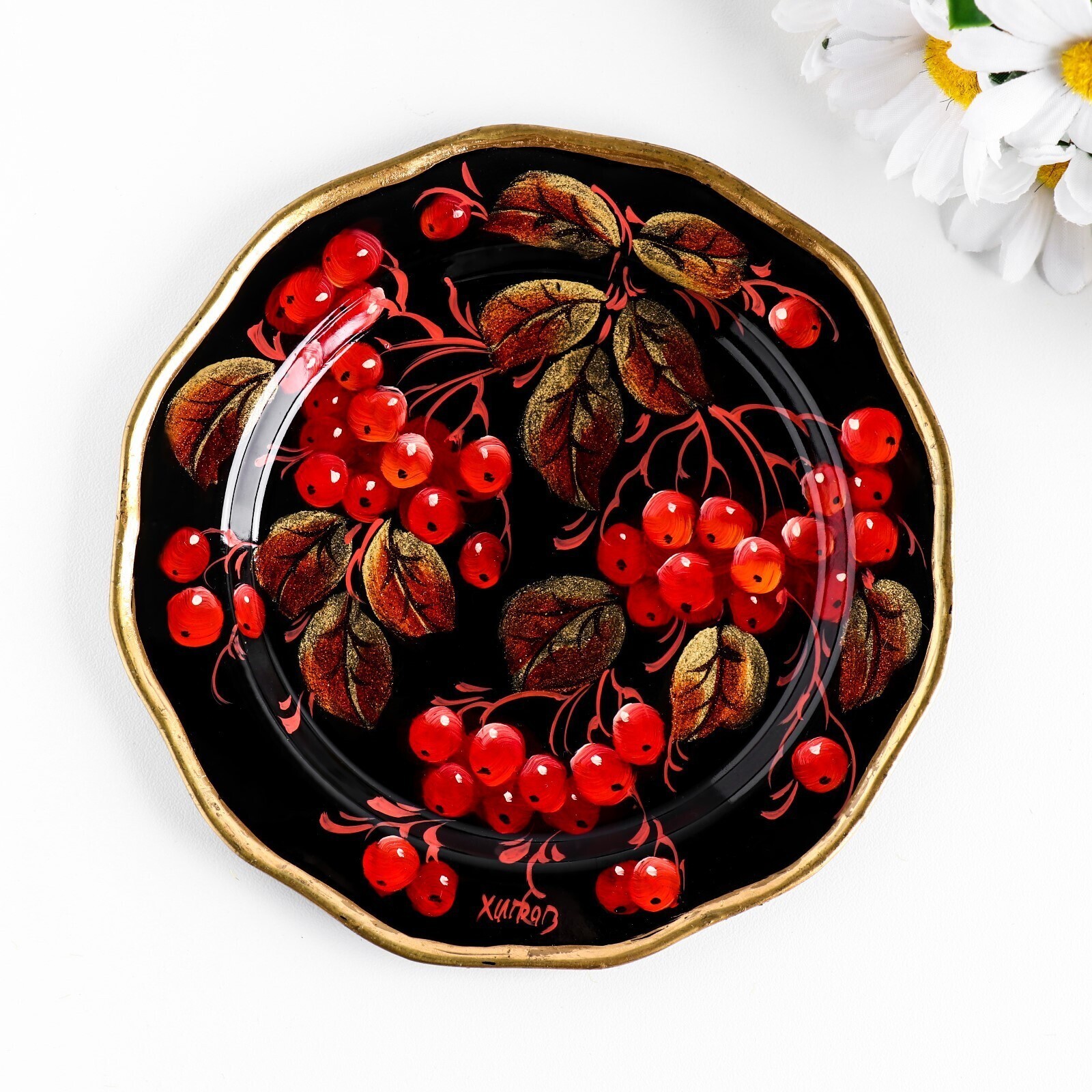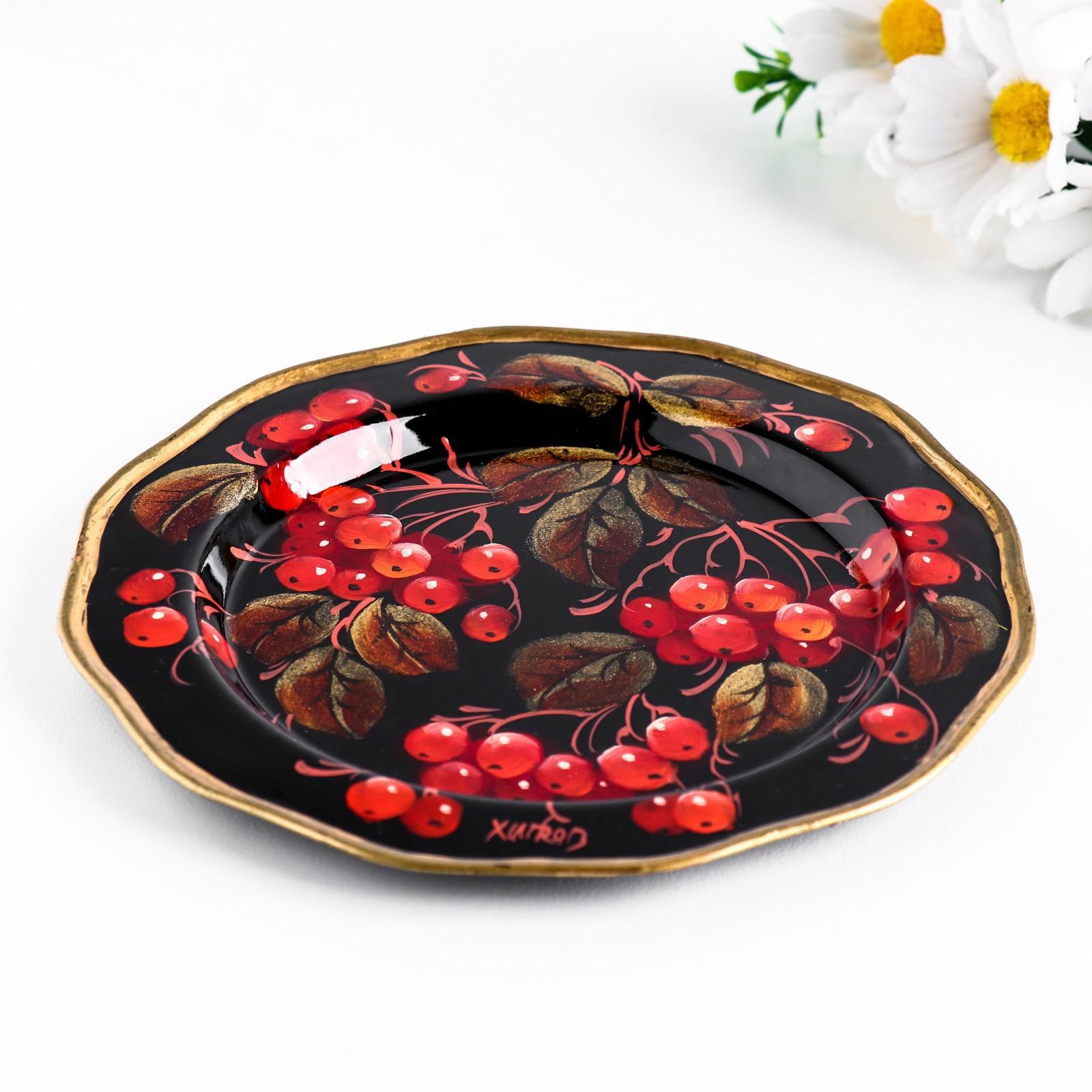 Поднос жостовский "Рябина", чёрный, с авторской росписью, D=17 см