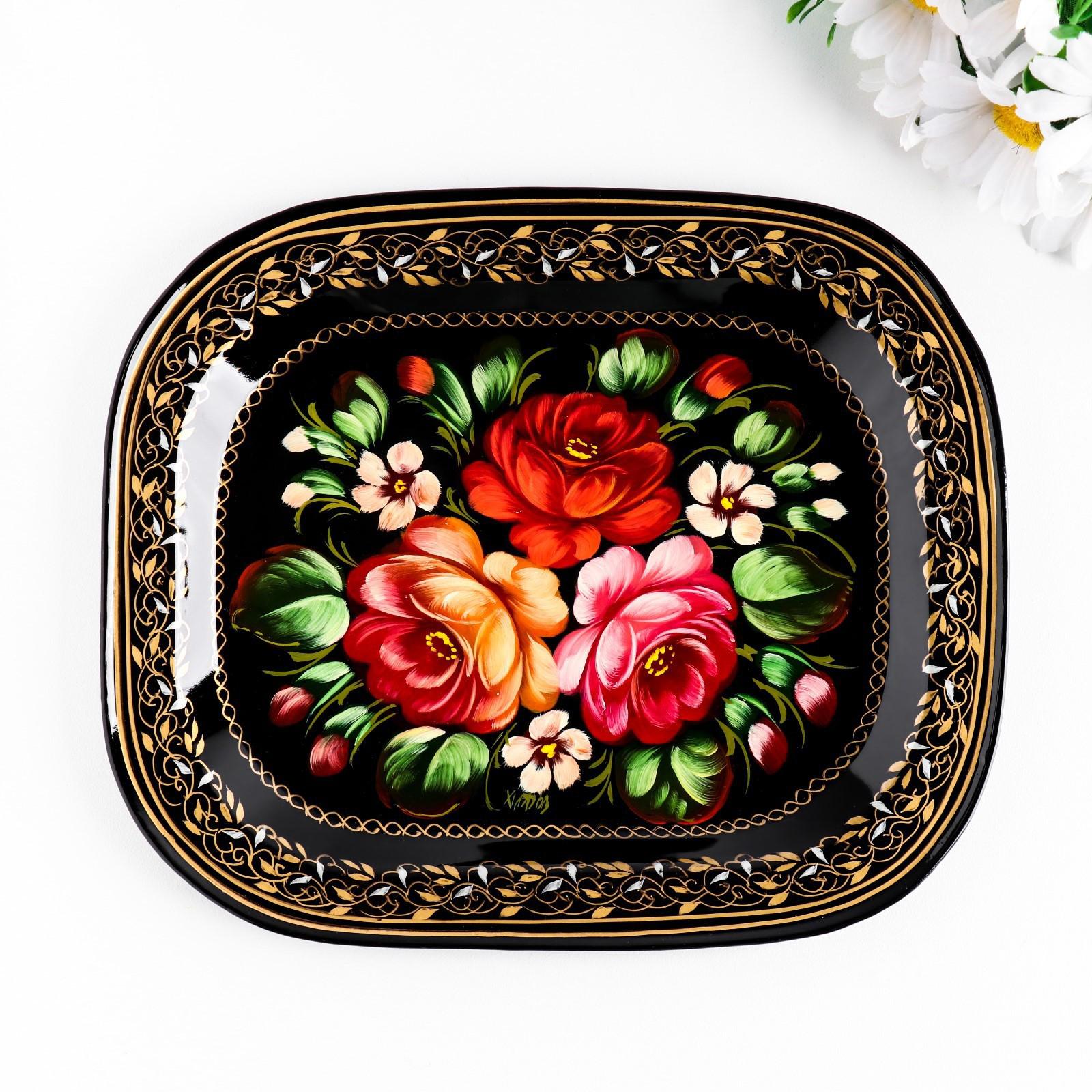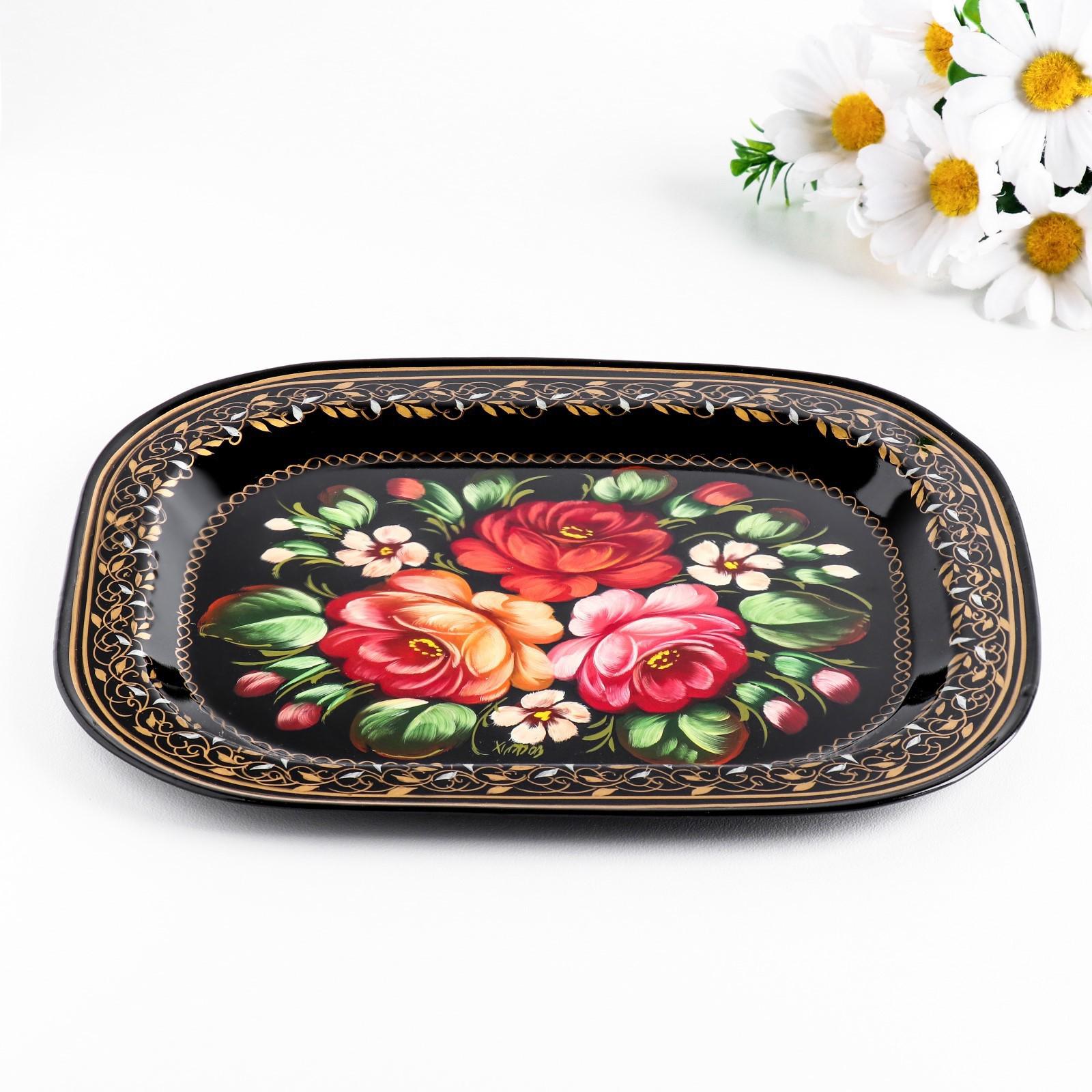 Поднос жостовский "Розы", черный, с авторской росписью, 24х20 см