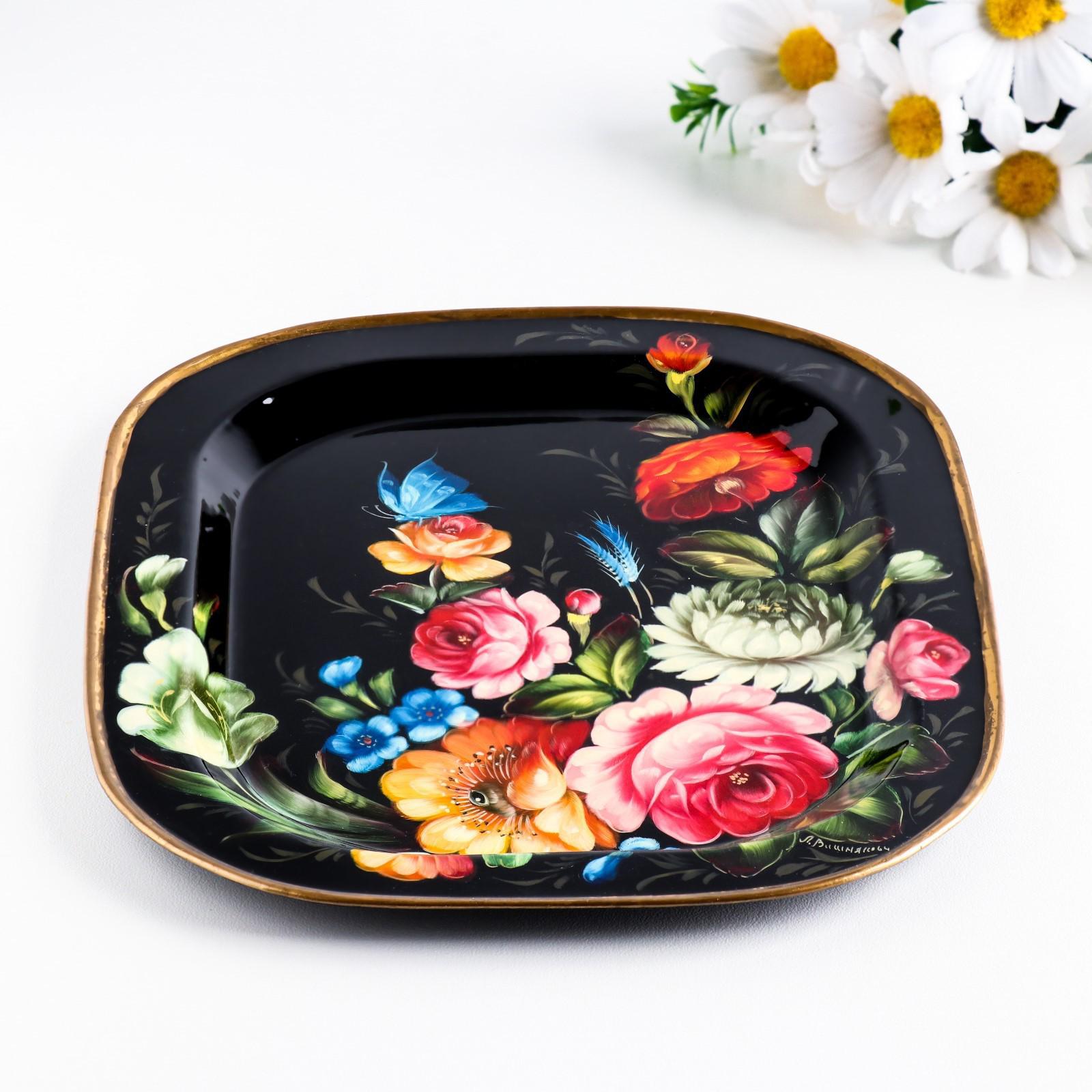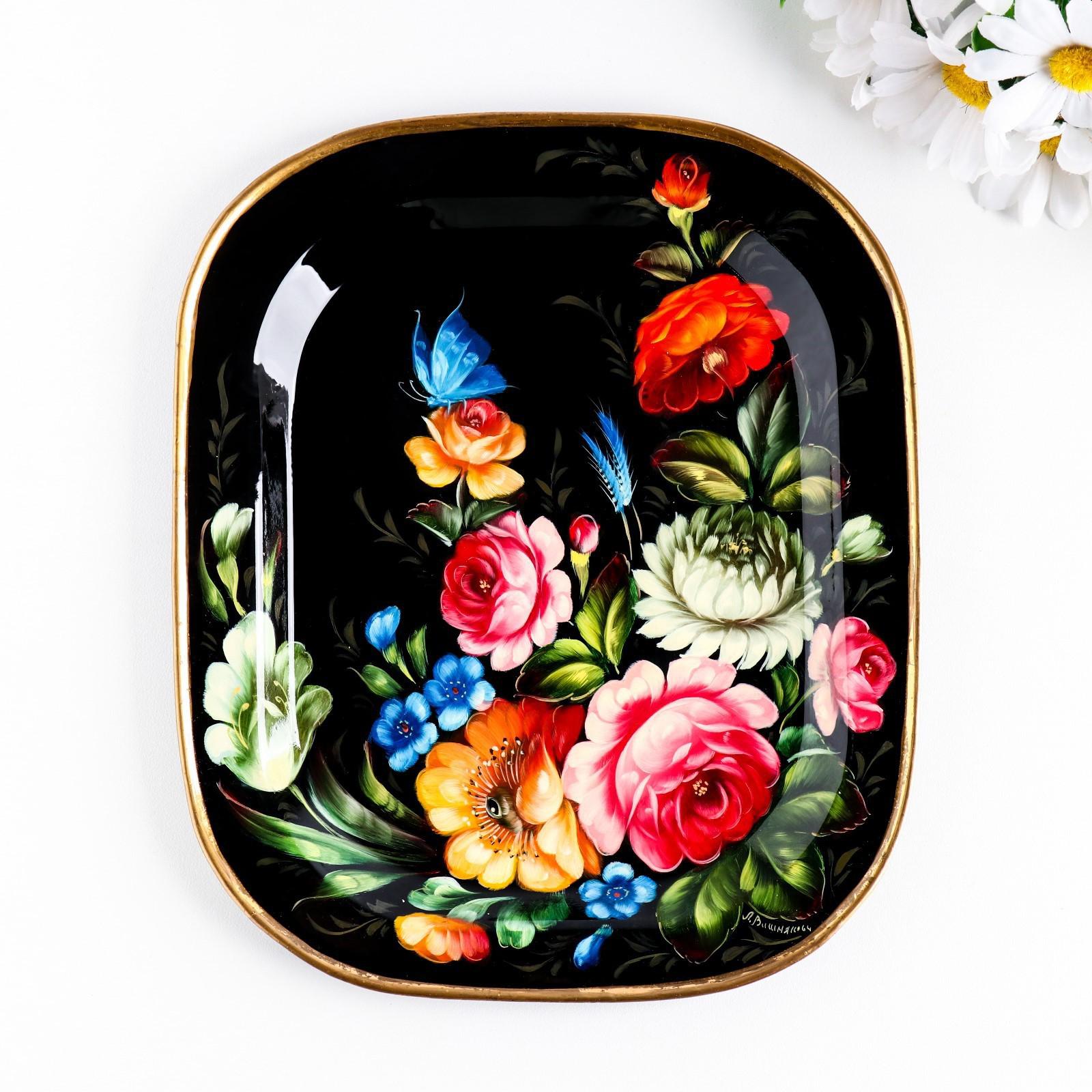 Поднос жостовский "Летний букет", черный, с авторской росписью, 24х20 см