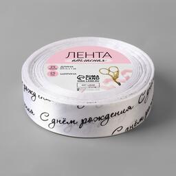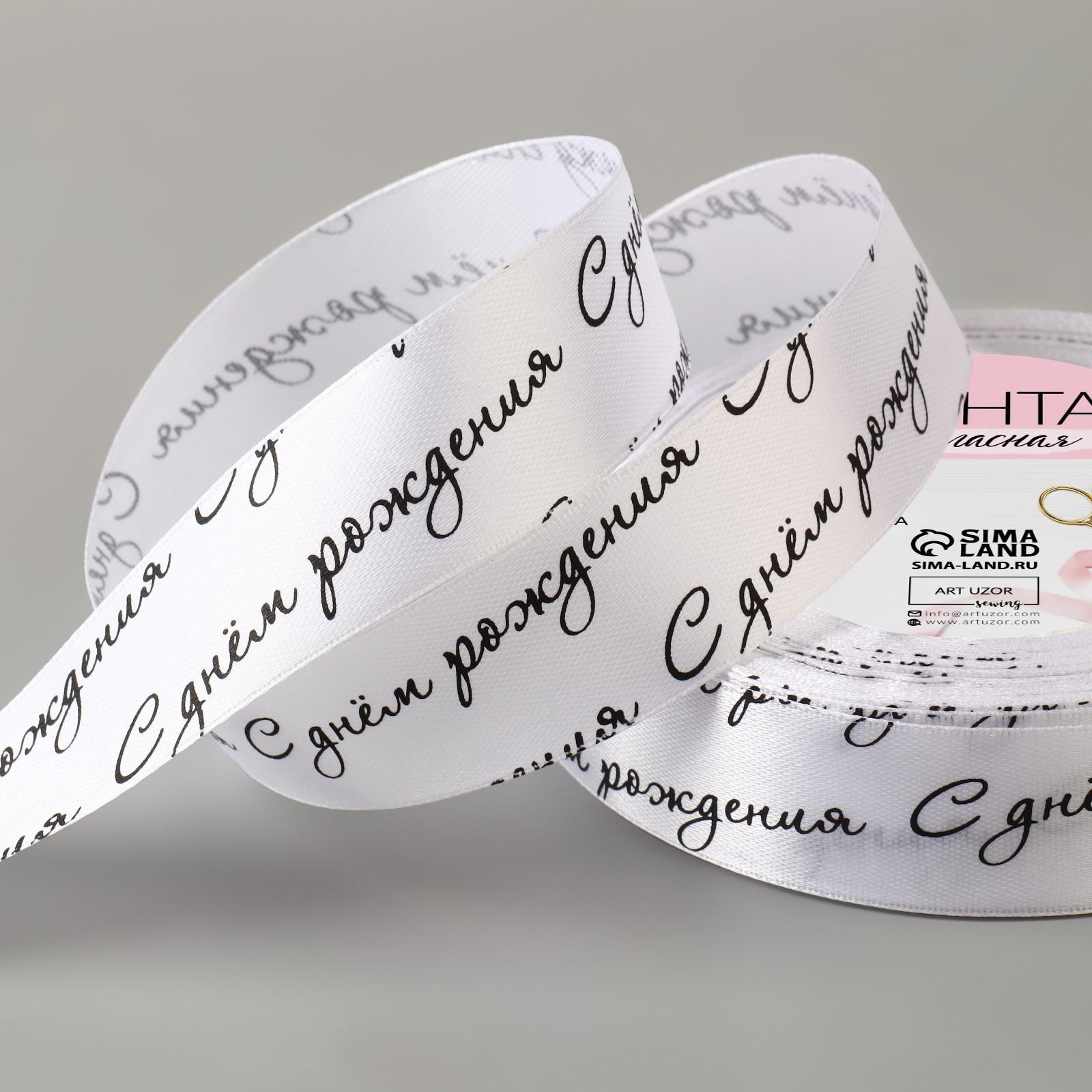 Лента атласная «С днём рождения», 25 мм × 23 ± 1 м, цвет белый/чёрный №001