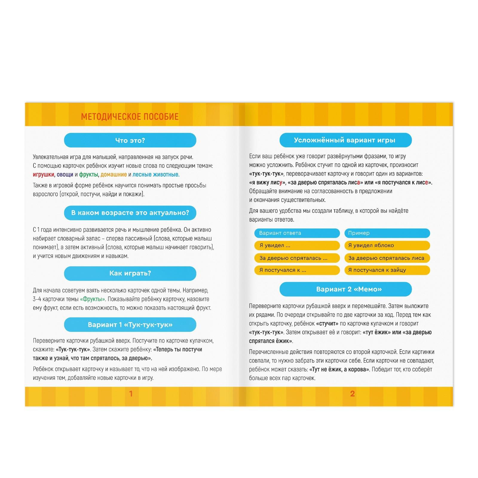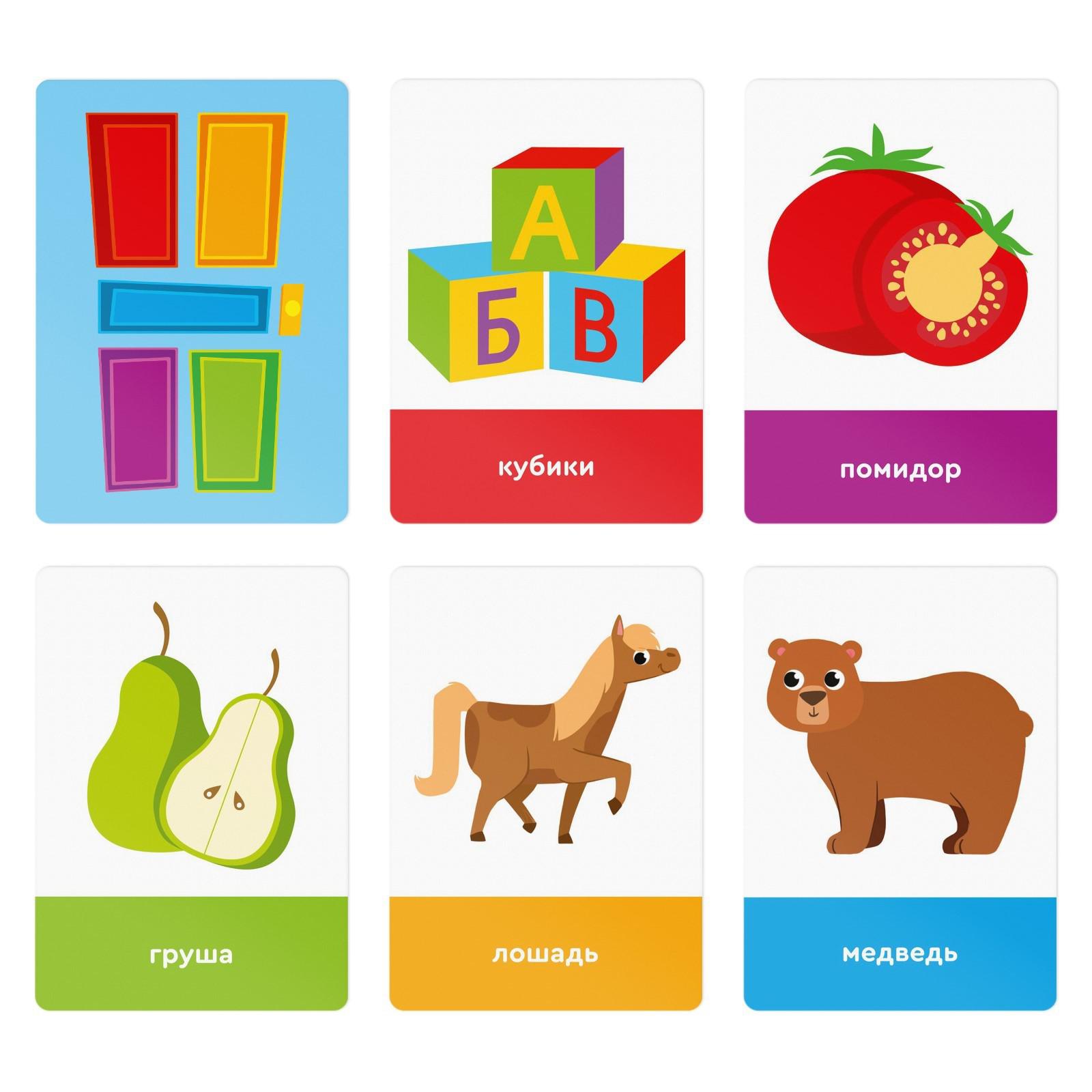 С помощью карочек ребёнок изучит новые слова по следующим темам: игрушки, овощи и фрукты, домашние и лесные животные.