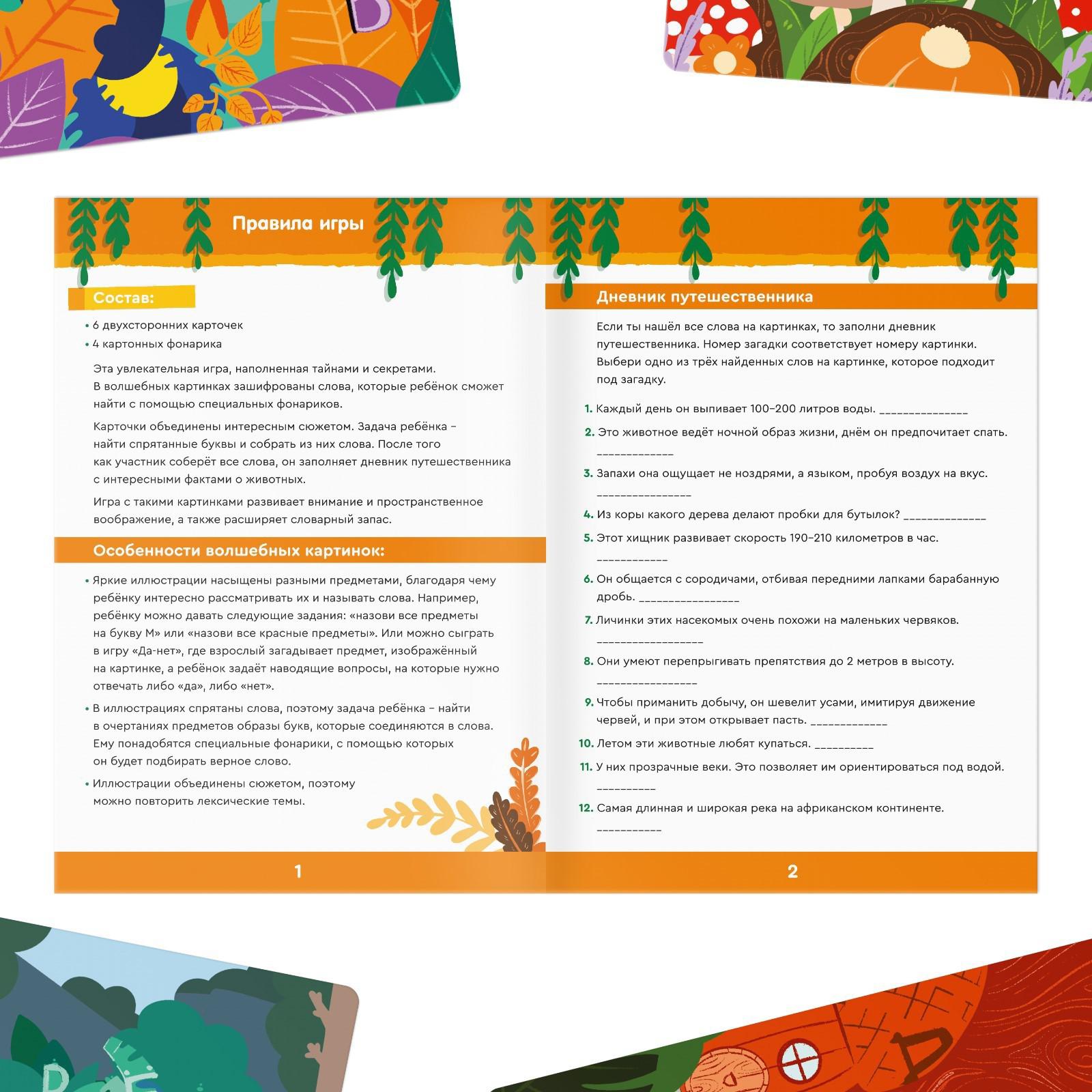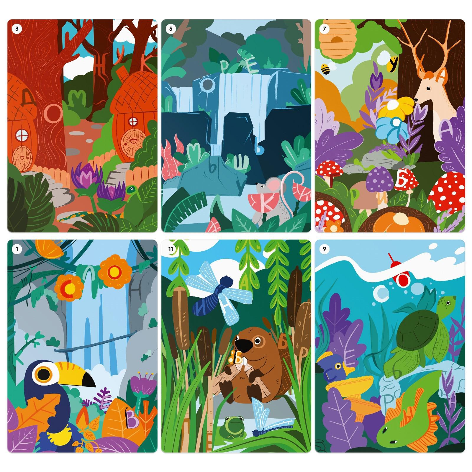 В этой игре малыша ждут волшебные картинки, на которых спрятаны слова. Ребёнок будет рассматривать карточки, искать буквы, складывать из них слова и развиваться! В правилах также есть дневник путешественника, который поможет узнать интересные факты о животных и насекомых.