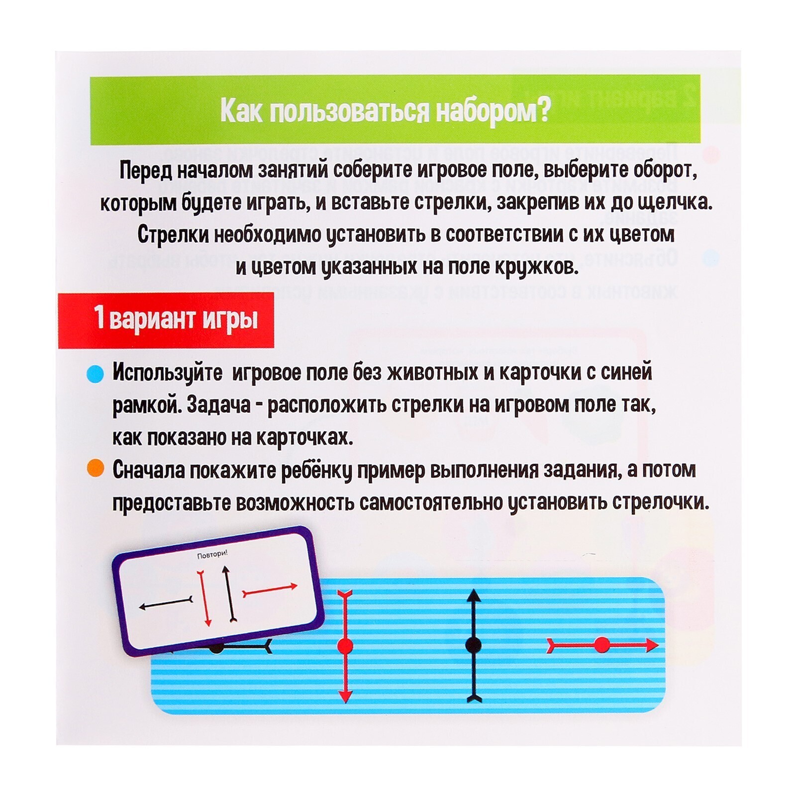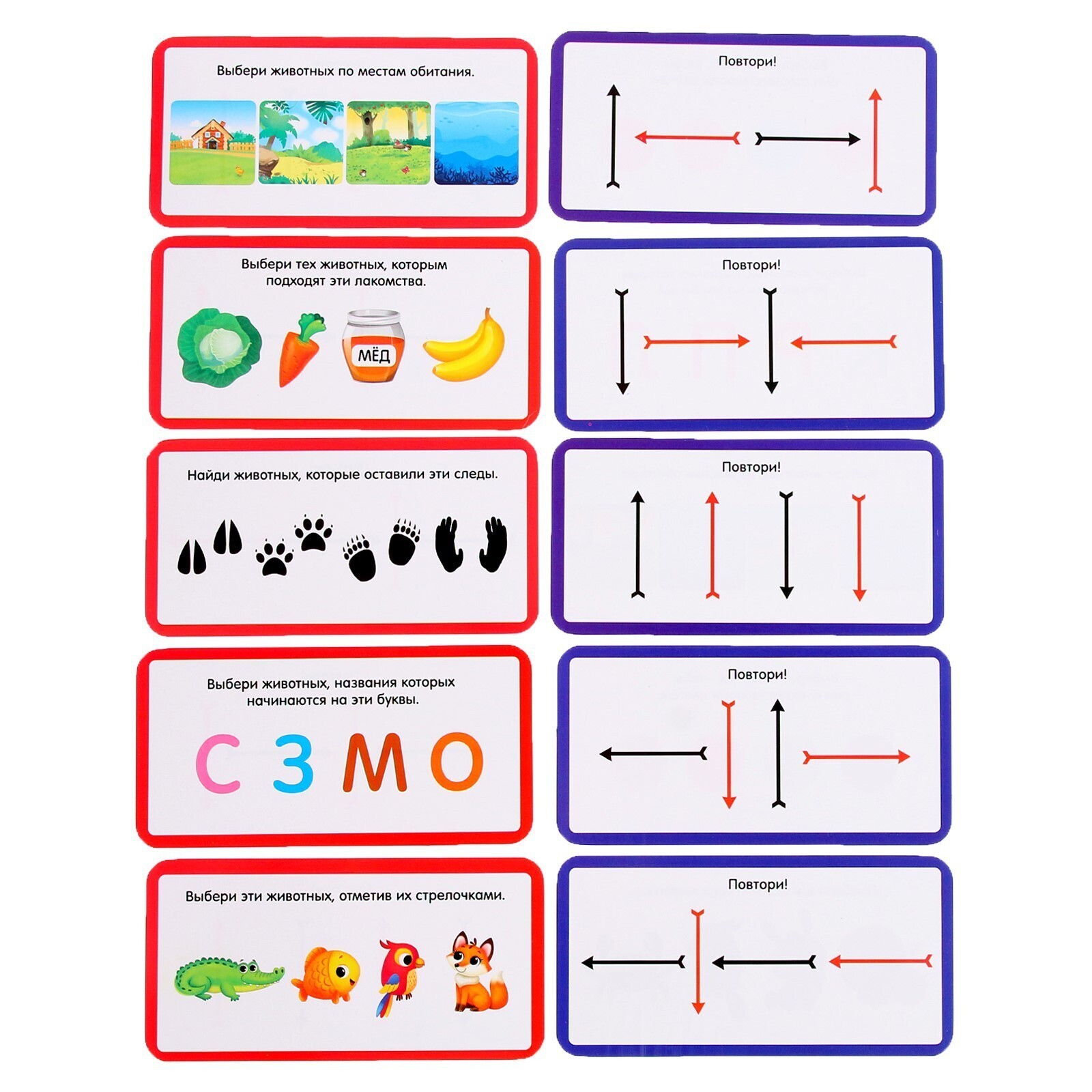 С одной стороны карточек попросите ребёнка расставить стрелки по образцу, а с другой — решить логические задачки про животных. Внутри вы также найдёте инструкцию с обучающими заданиями.