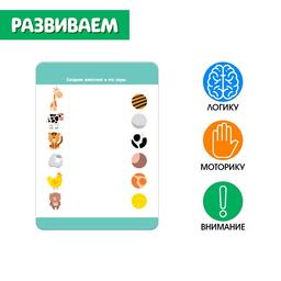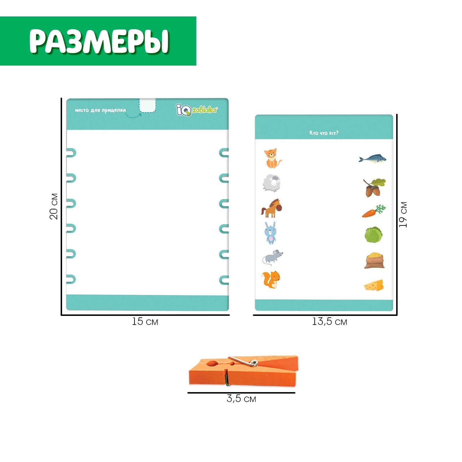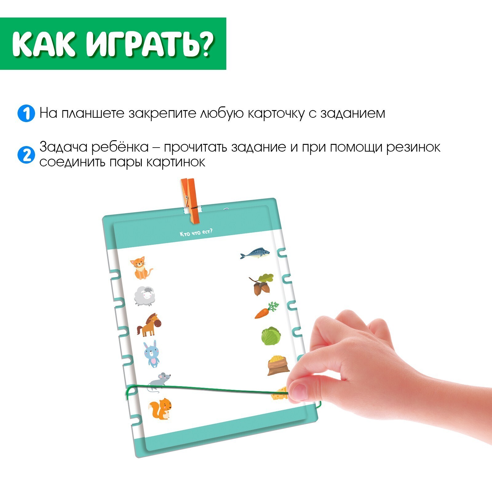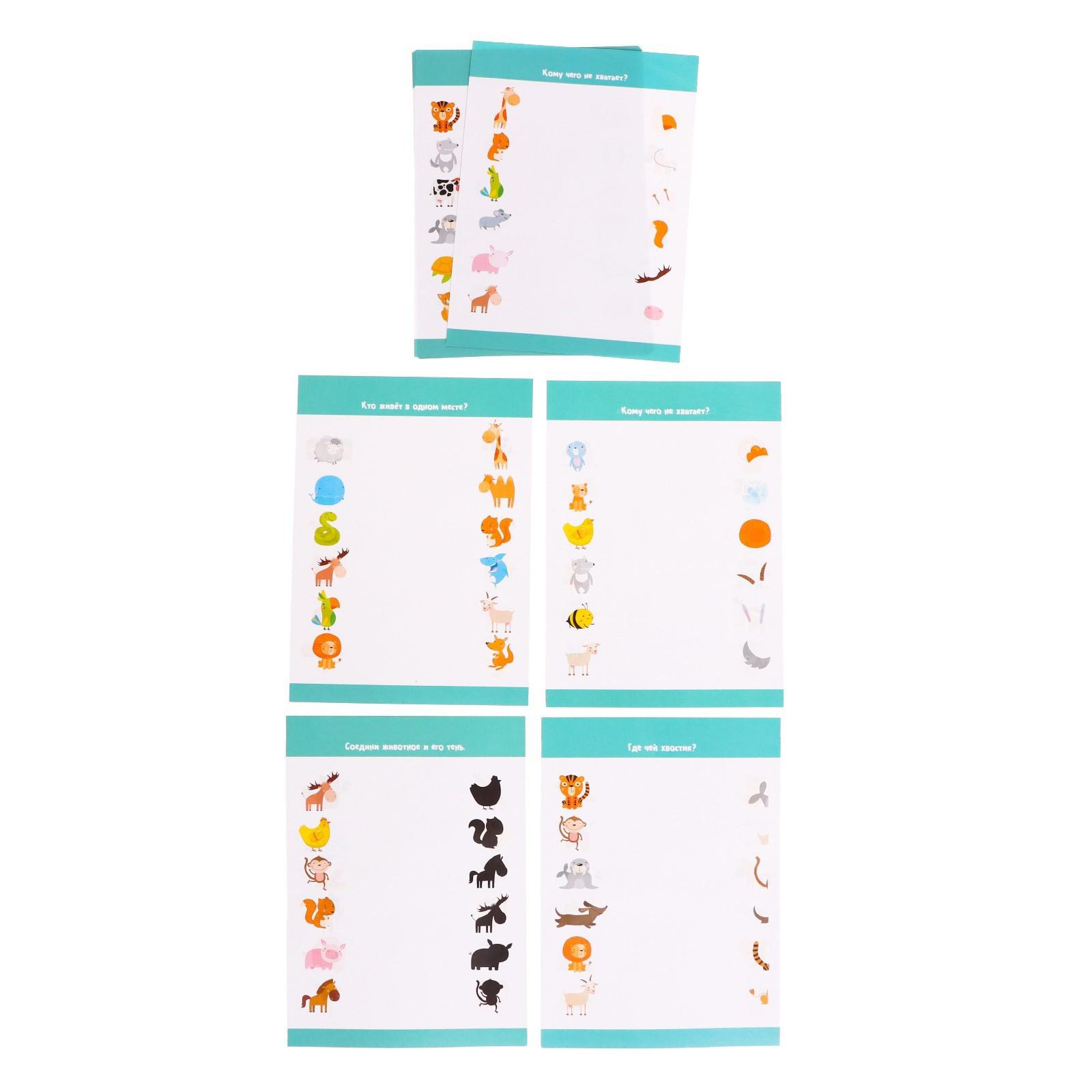 Развивающий набор «Весёлые зверушки» состоит из 20 увлекательных заданий на логику, планшета для карточек, резиночек и прищепки.