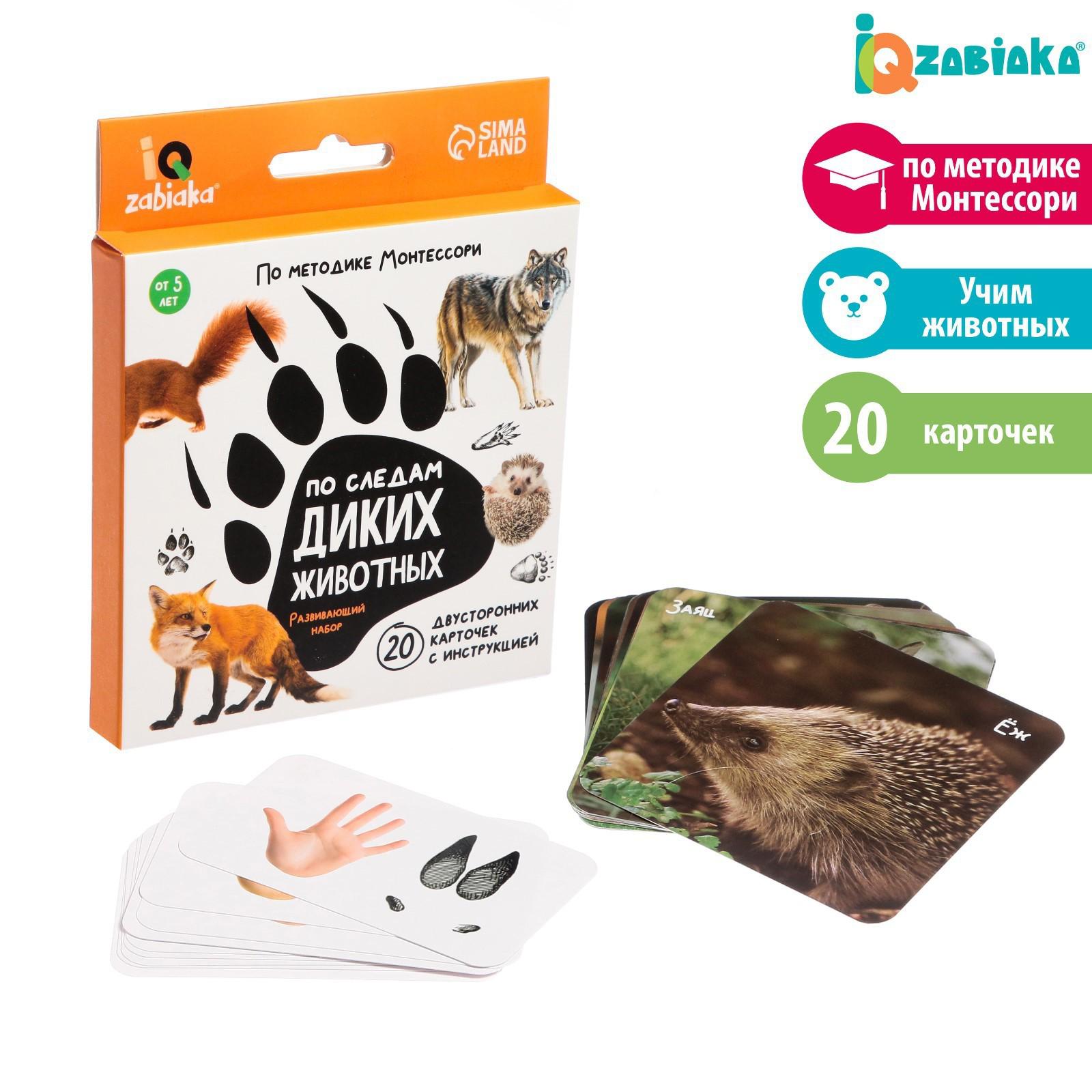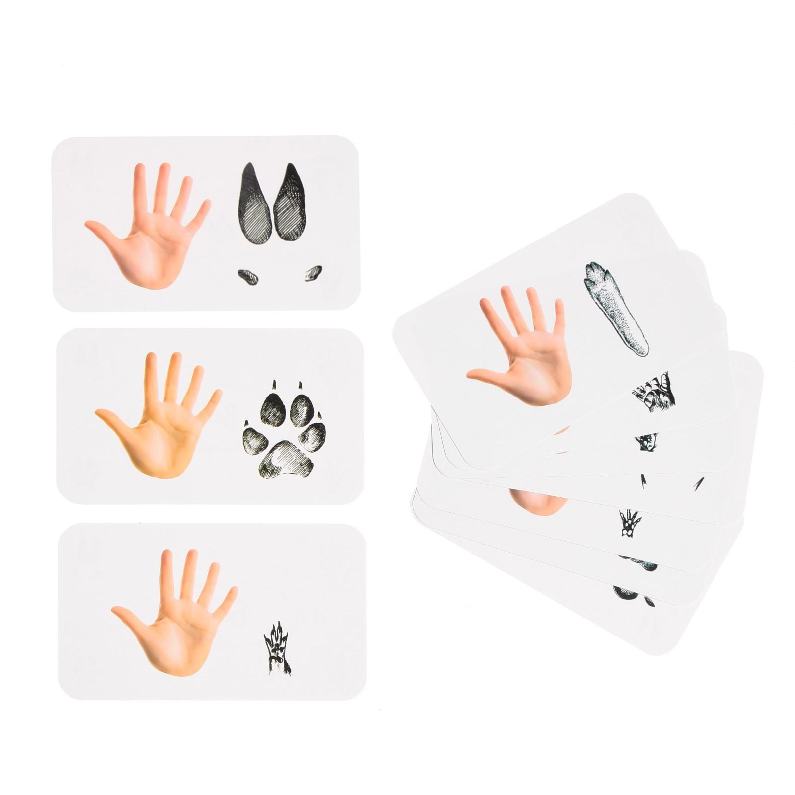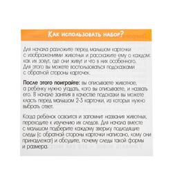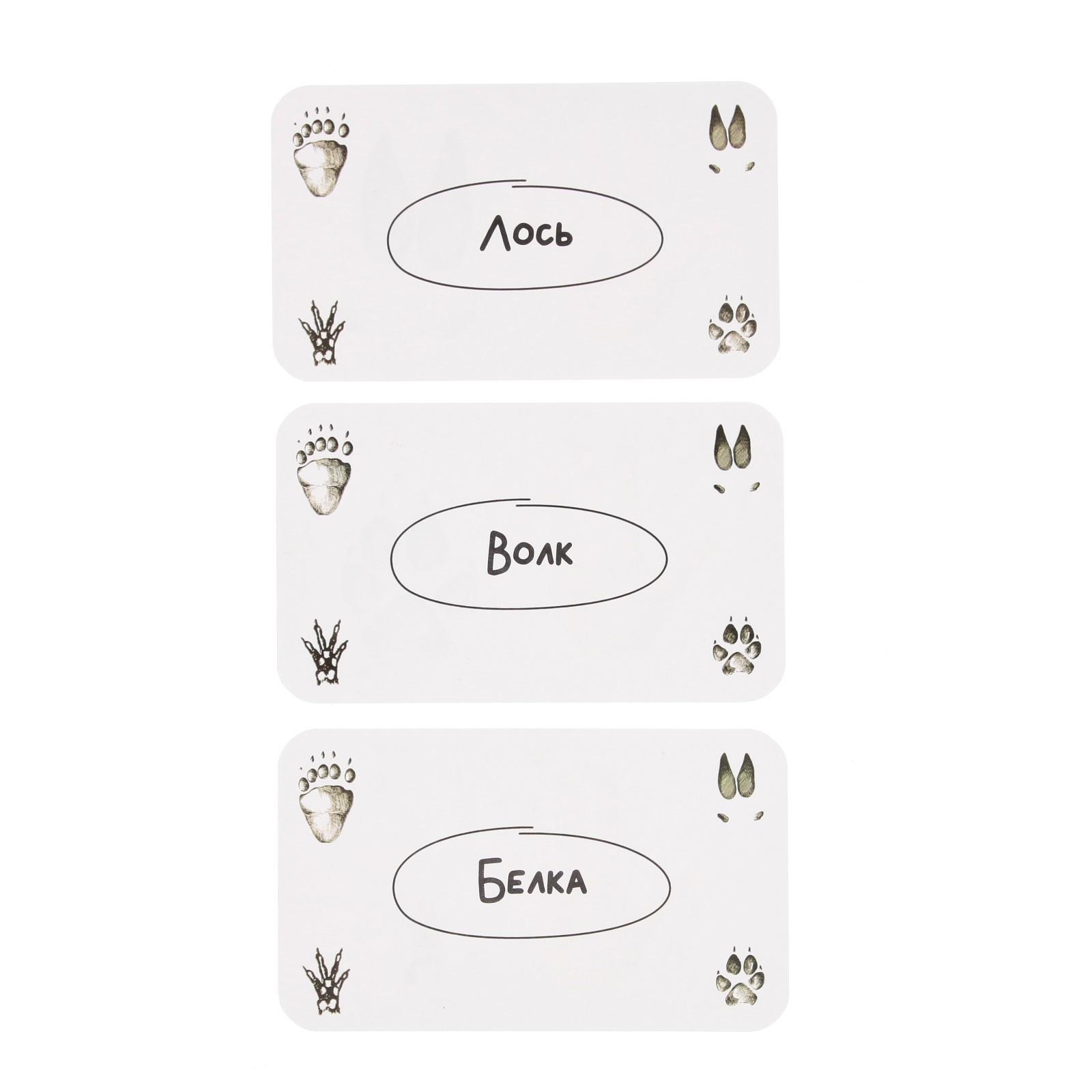 Внутри вы найдёте 10 карточек с описанием и 10 карточек со следами зверей.