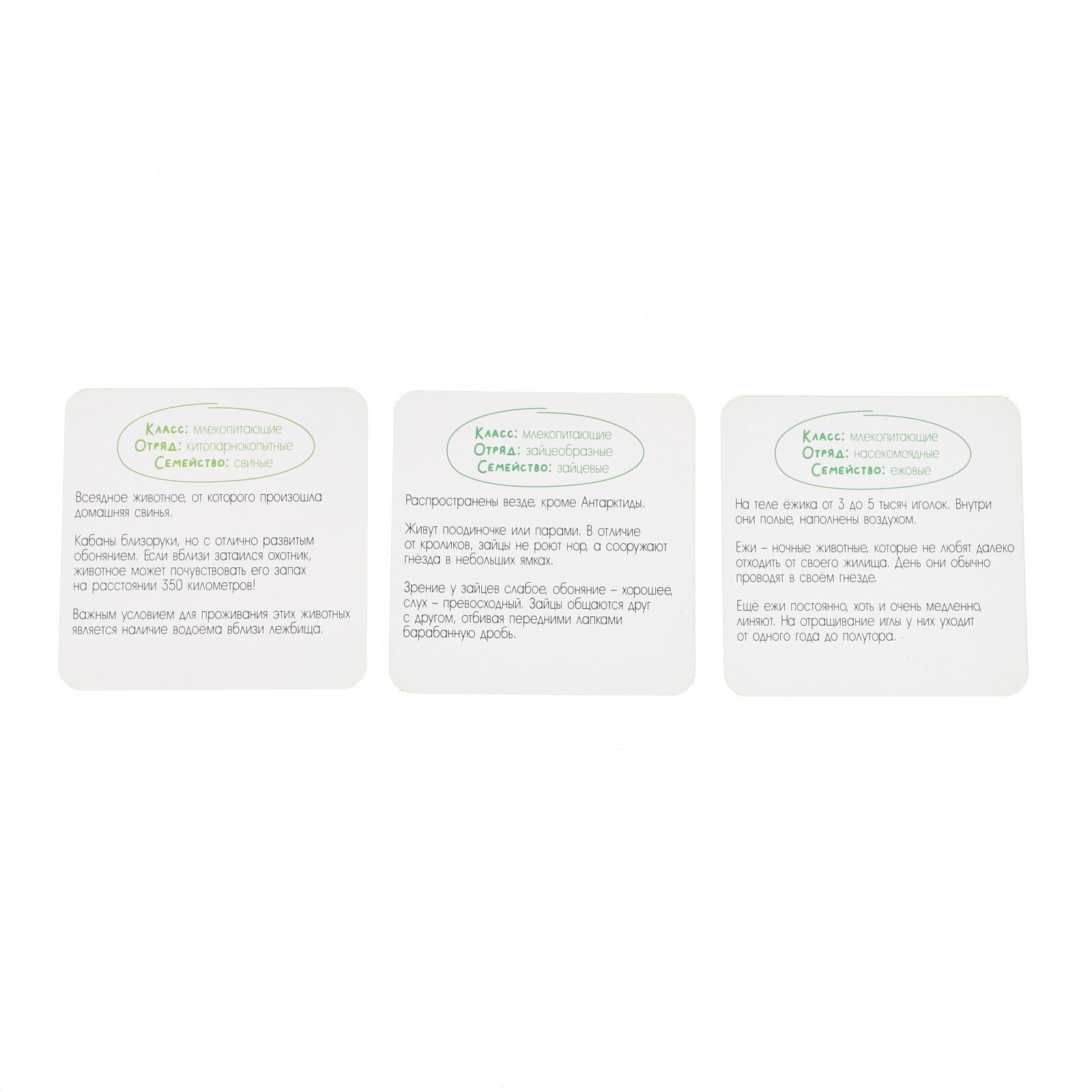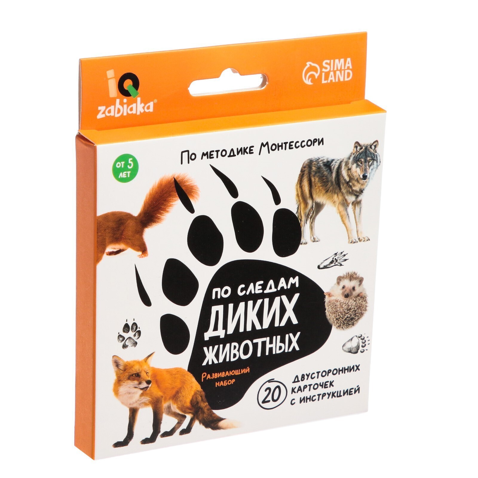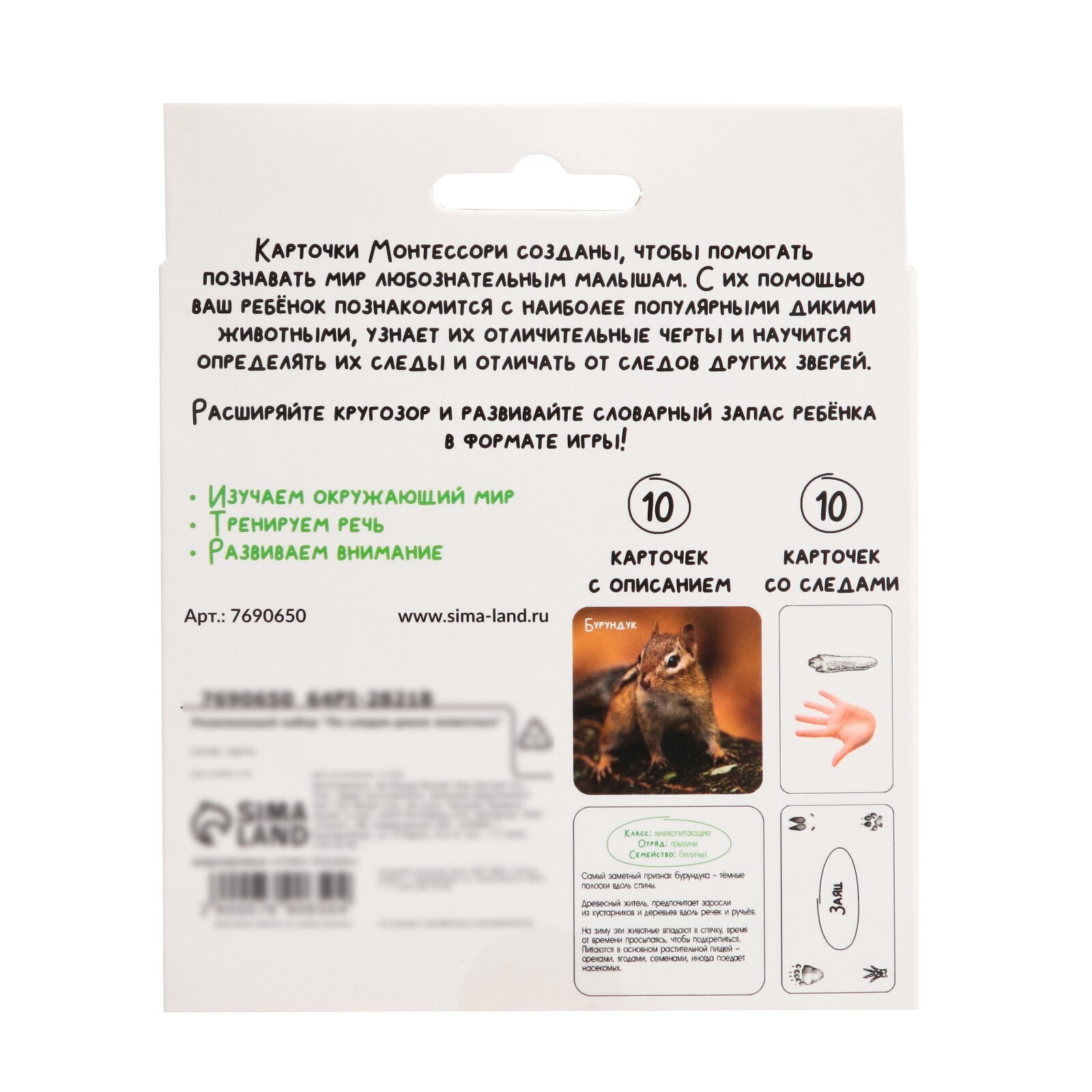 Внутри вы найдёте 10 карточек с описанием и 10 карточек со следами зверей.