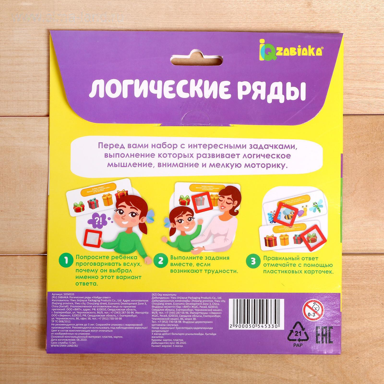 Развивающий набор «Логические ряды: найди ответ», создан для детей от 3 лет. В комплект входит 20 заданий и 5 пластиковых карточек.
