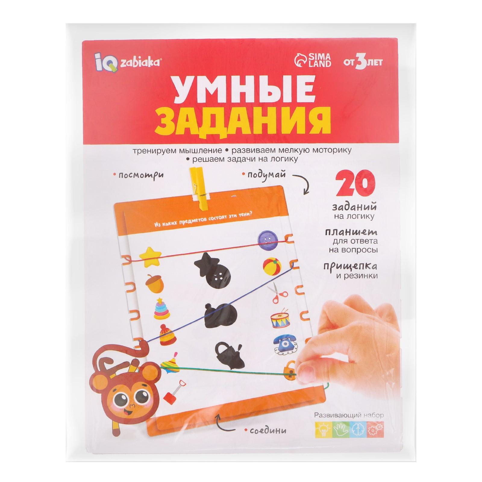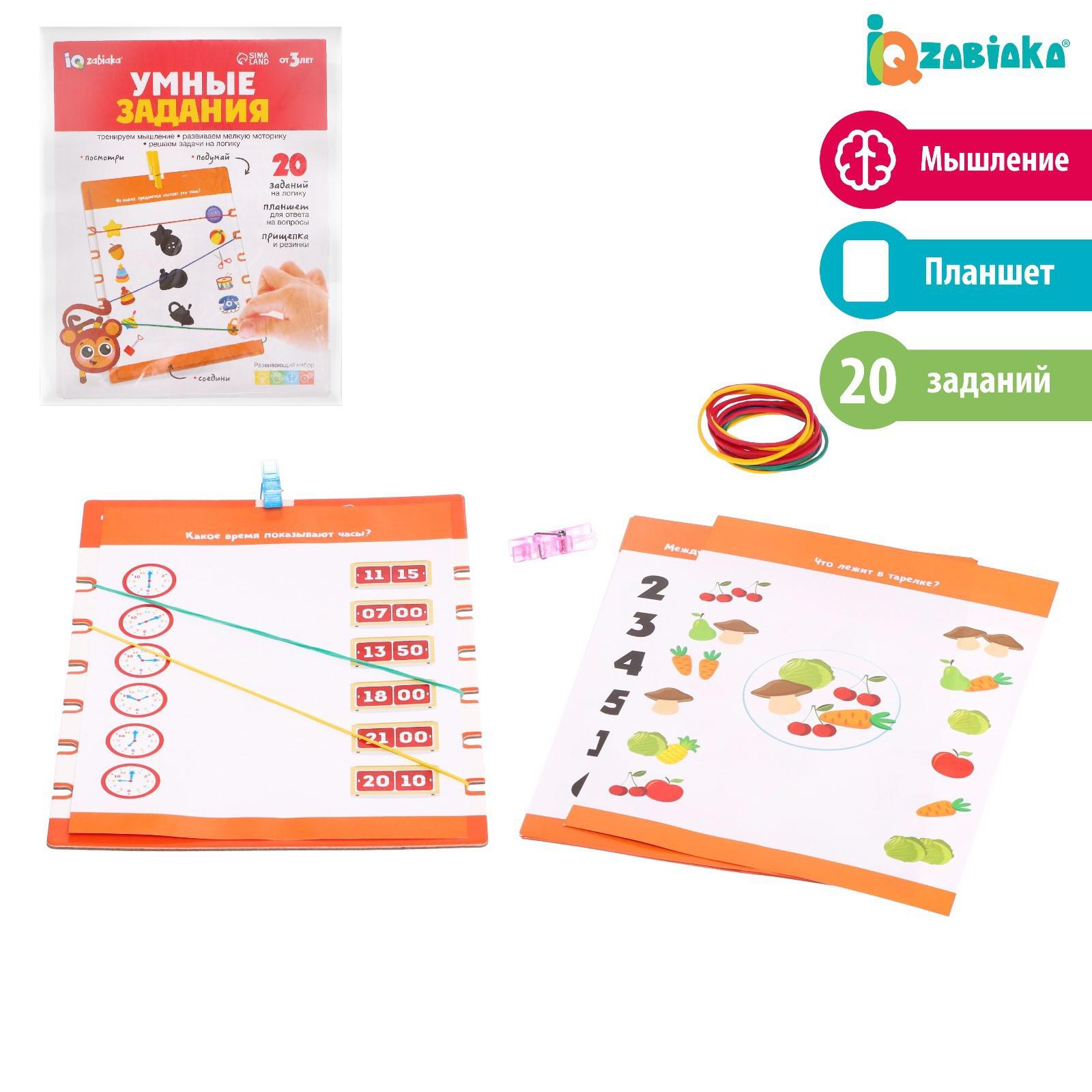 Развивающий набор «Умные задания» — это 20 увлекательных заданий на логику, которые предстоит решать с помощью планшета для карточек, резиночек и прищепки.