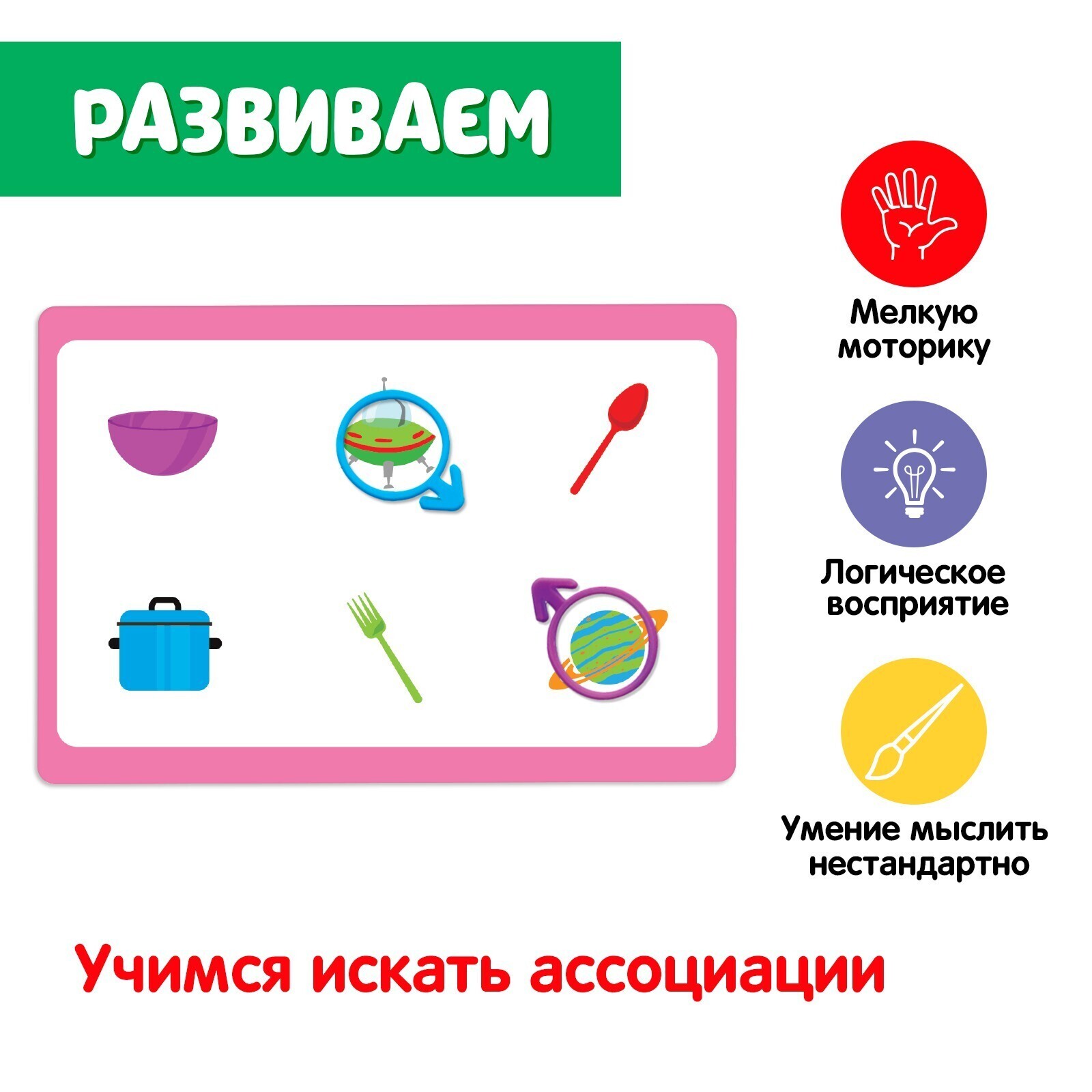 Развивающий набор «Нелогичные ассоциации» поможет малышу научится нестандартно мыслить и находить общие признаки у самых разных предметов.