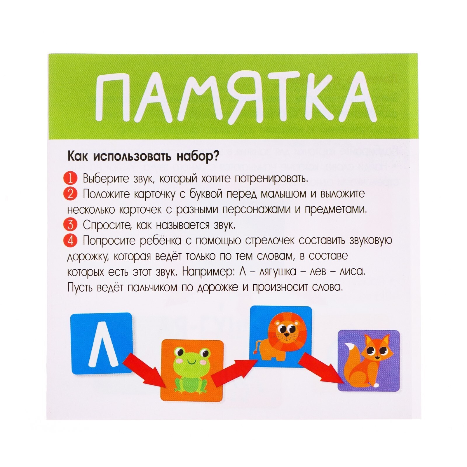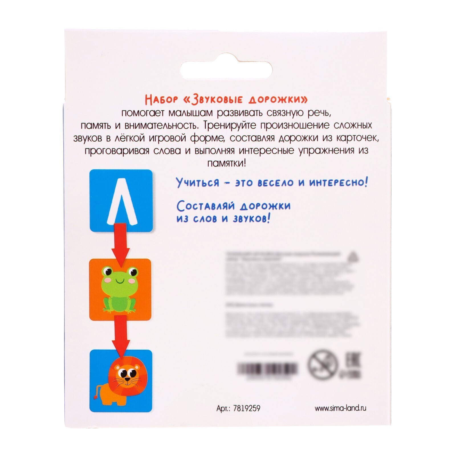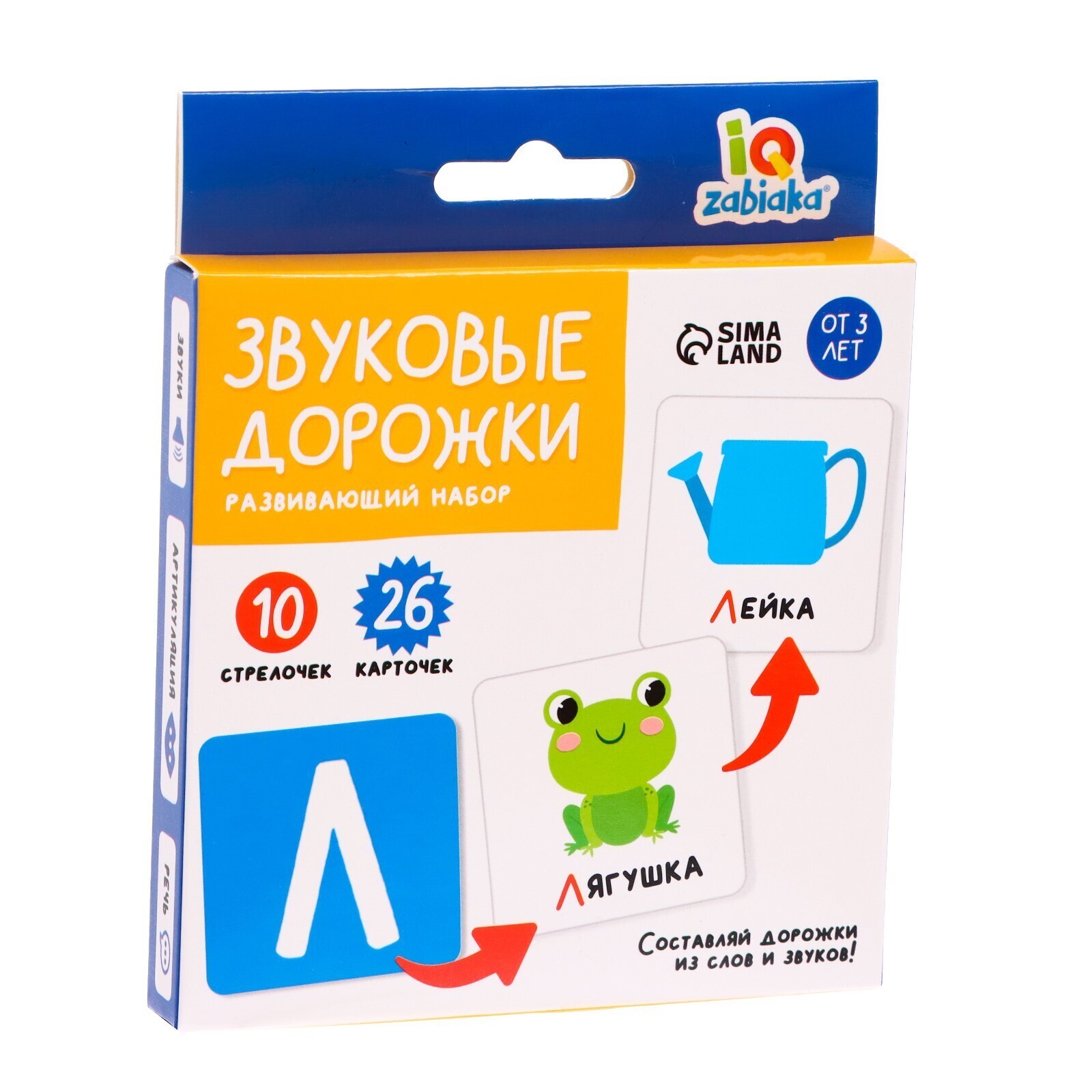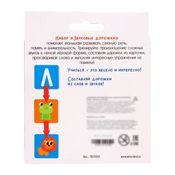 С развивающим набором «Звуковые дорожки» малыш потренирует произношение сложных звуков, познакомится с забавными животными и выучит цвета. Внутри вы найдёте 10 стрелочек и 26 карточек.