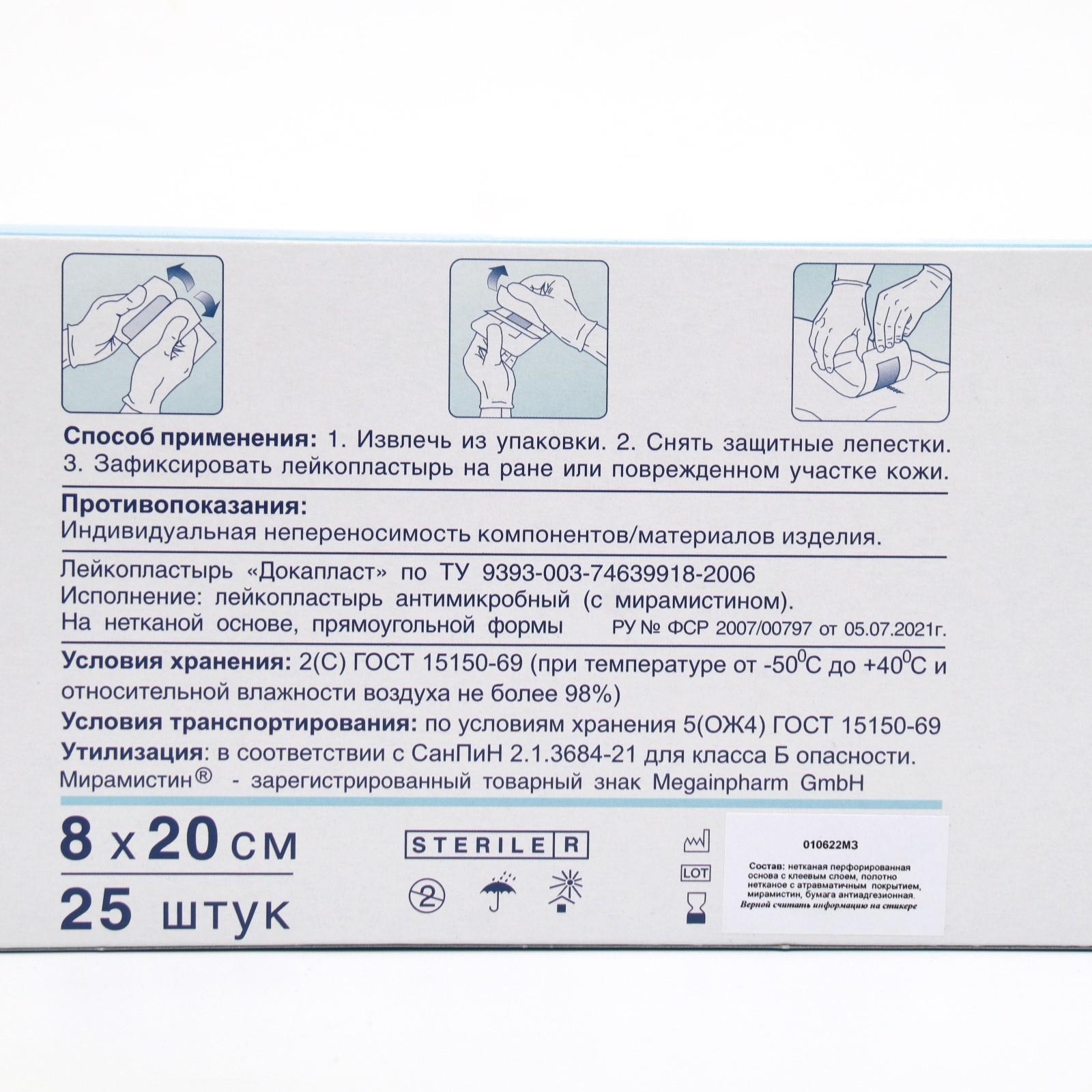 Докапласт - стерильные повязки-пластыри на основе мягкого нетканого полотна с не прилипающей к ране сорбционной подушечкой. За счет эластичности повязка хорошо моделируется на любой части тела. На основу повязки дискретно нанесен гипоаллергенный клей, что обеспечивает хорошую воздухопроницаемость. Повязка надежно фиксируется, легко и безболезненно удаляется. Для предотвращения инфицирования сорбционная подушечка пропитывается, в зависимости от вида изделия: мирамистином, обладающим широким спектром антимикробного действия; протарголом – коллоидным серебром, обеспечивающим антибактериальную защиту, или бриллиантовым зеленым – бактерицидное действие.