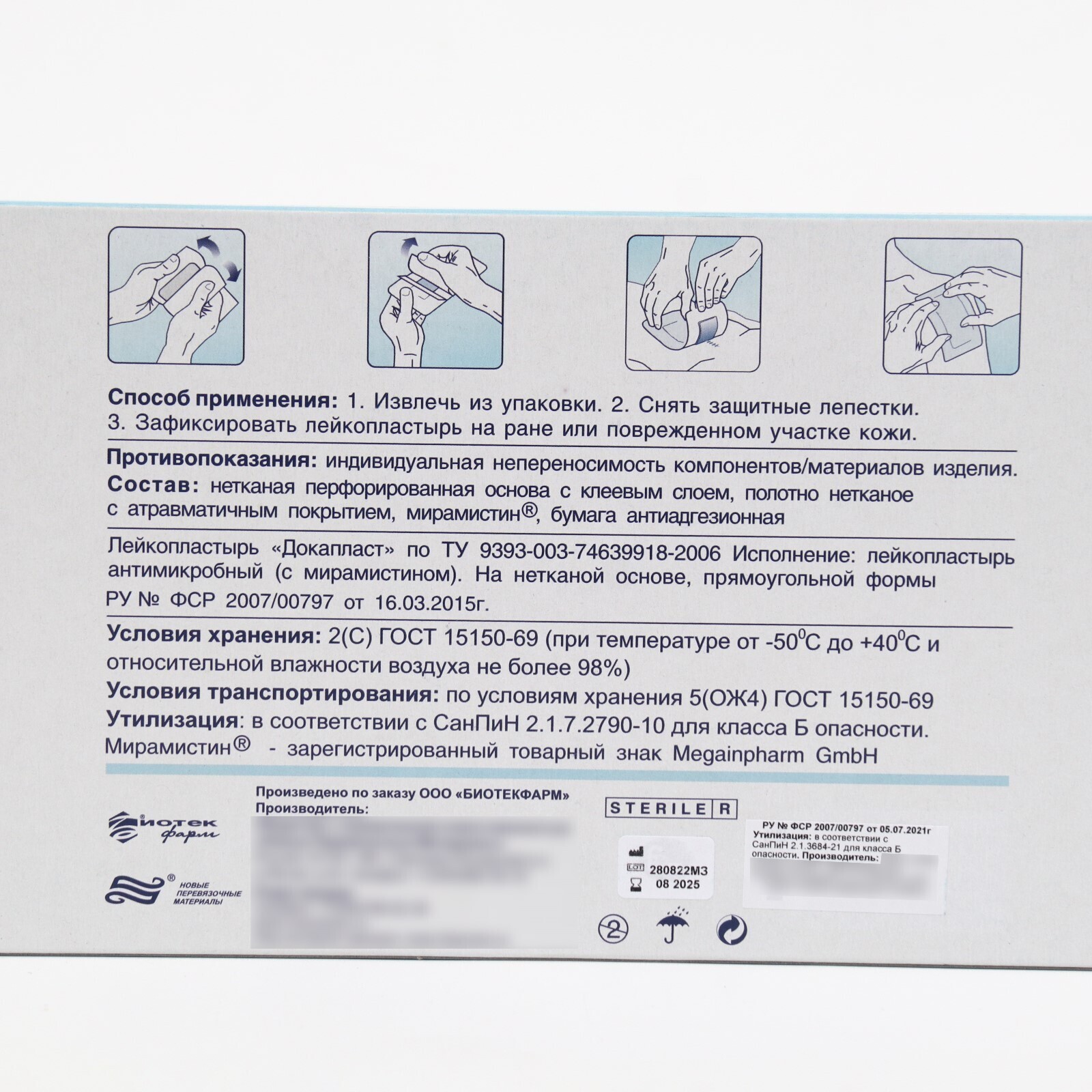 Докапласт - стерильные повязки-пластыри на основе мягкого нетканого полотна с не прилипающей к ране сорбционной подушечкой. За счет эластичности повязка хорошо моделируется на любой части тела. На основу повязки дискретно нанесен гипоаллергенный клей, что обеспечивает хорошую воздухопроницаемость. Повязка надежно фиксируется, легко и безболезненно удаляется. Для предотвращения инфицирования сорбционная подушечка пропитывается, в зависимости от вида изделия: мирамистином, обладающим широким спектром антимикробного действия; протарголом – коллоидным серебром, обеспечивающим антибактериальную защиту, или бриллиантовым зеленым – бактерицидное действие.