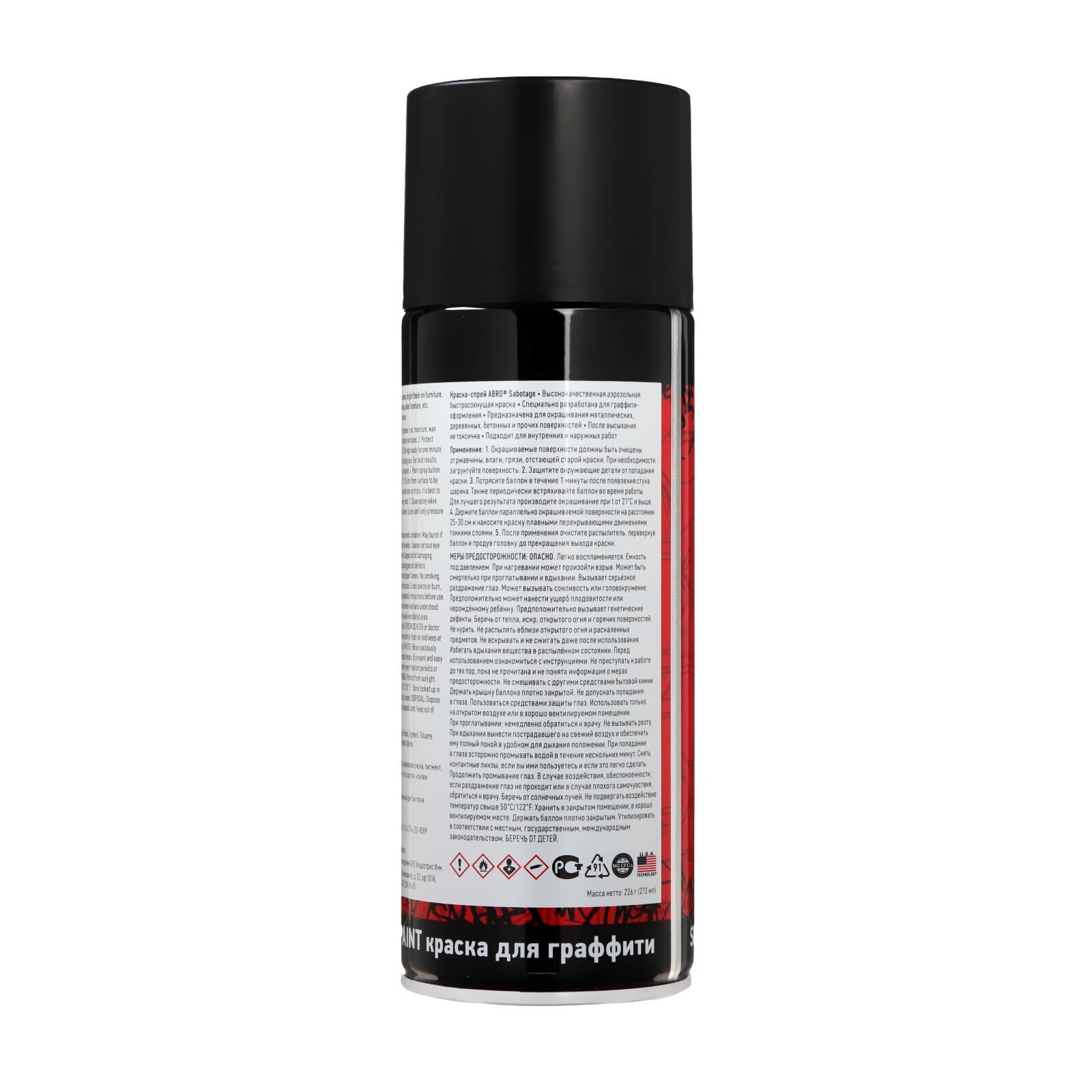 Быстросохнущая акриловая краска-спрей ABRO Sabotage используется для окраски, ремонта, художественного оформления и граффити. Предназначена для окрашивания металлических, деревянных, бетонных и прочих поверхностей.