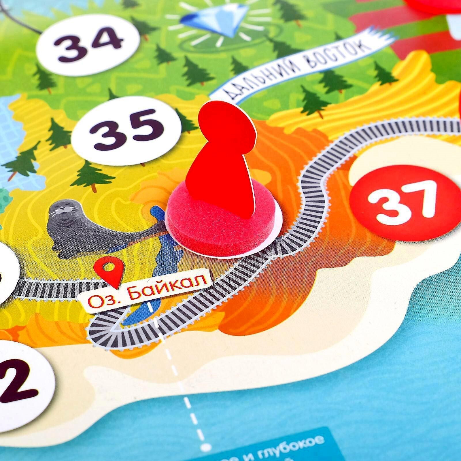Внутри набора вас ждёт большое игровое поле с различными городами и их описаниями, флаг. Герб, достопримечательности и другие особенности нашей Родины — освежить в памяти знания о стране будет интересно даже взрослому!