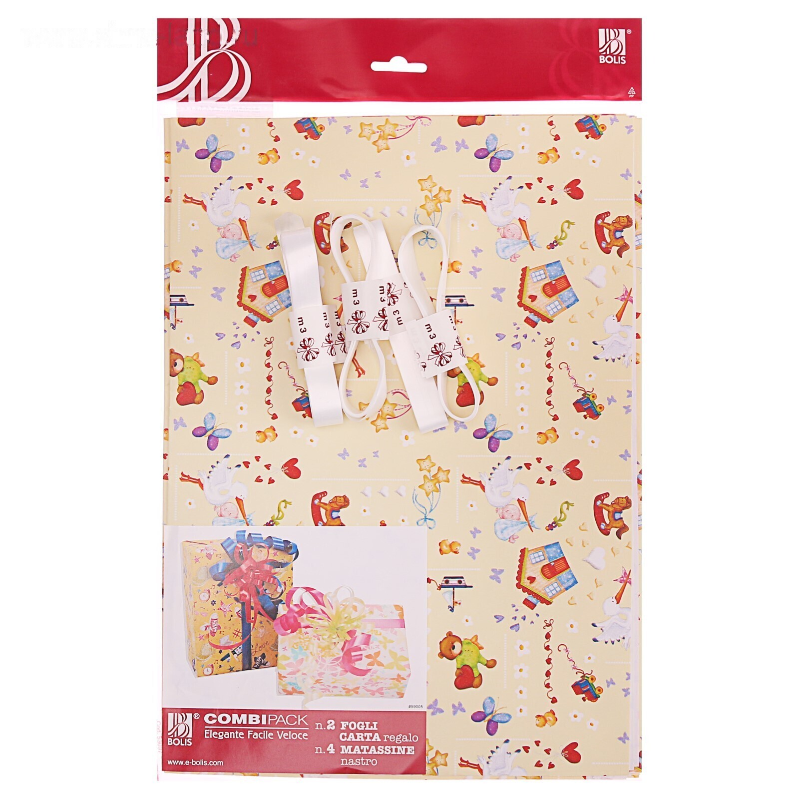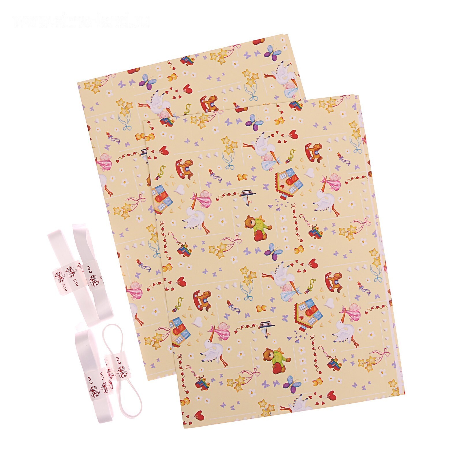 Набор для упаковки, "С рождением", крафт, светло-жёлтый 0,7 х 1 м х 2, лента 15 мм х 3 м х 4 39209