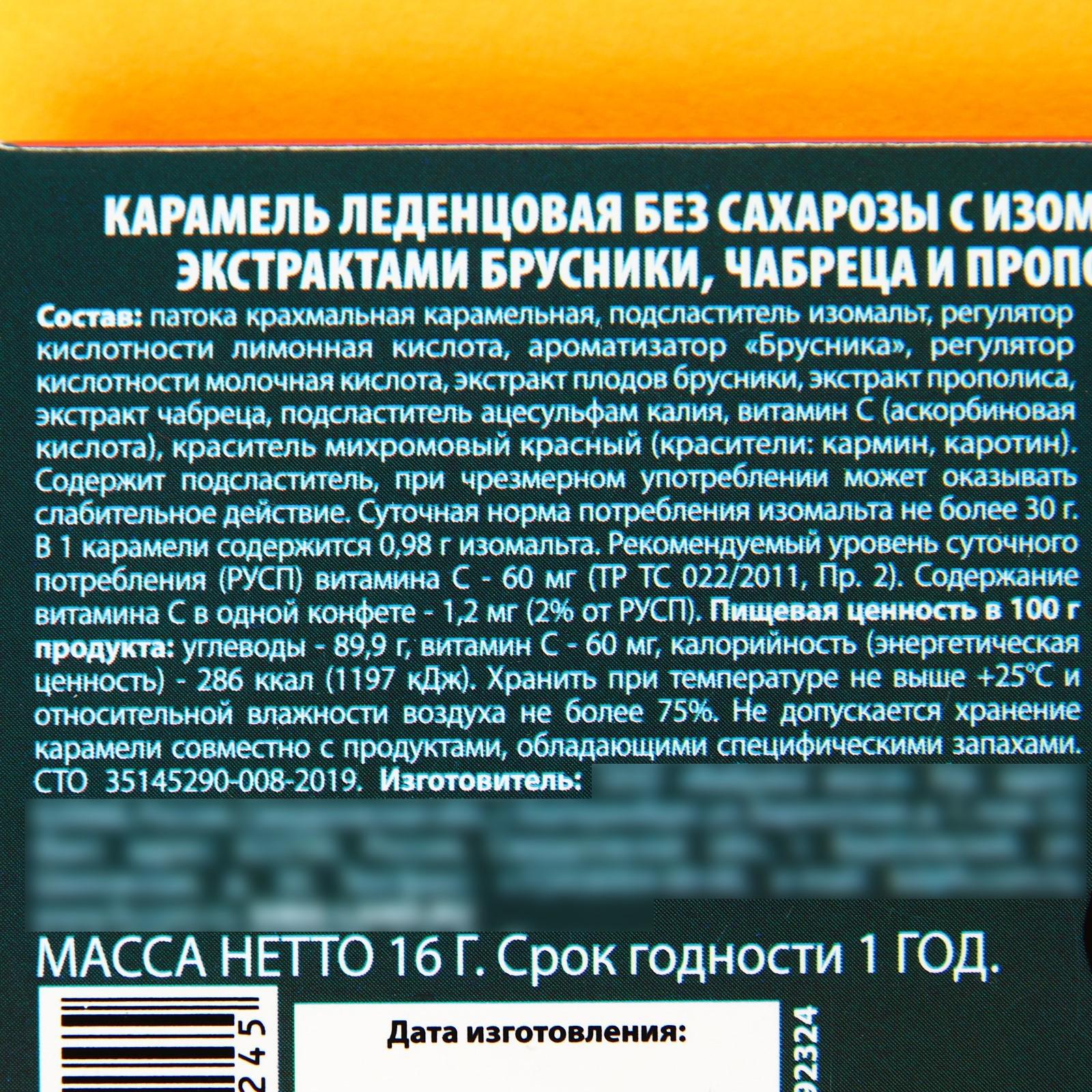 Состав: патока крахмальная карамельная, подсластитель – изомальт, вода питьевая, регулятор кислотности – лимонная кислота, экстракт прополиса, экстракт плодов брусники, ароматизатор «Брусника», экстракт чабреца, краситель натуральный – михромовый красный (красители: кармин, каротин), подсластитель – ацесульфам калия, витамин С (аскорбиновая кислота).