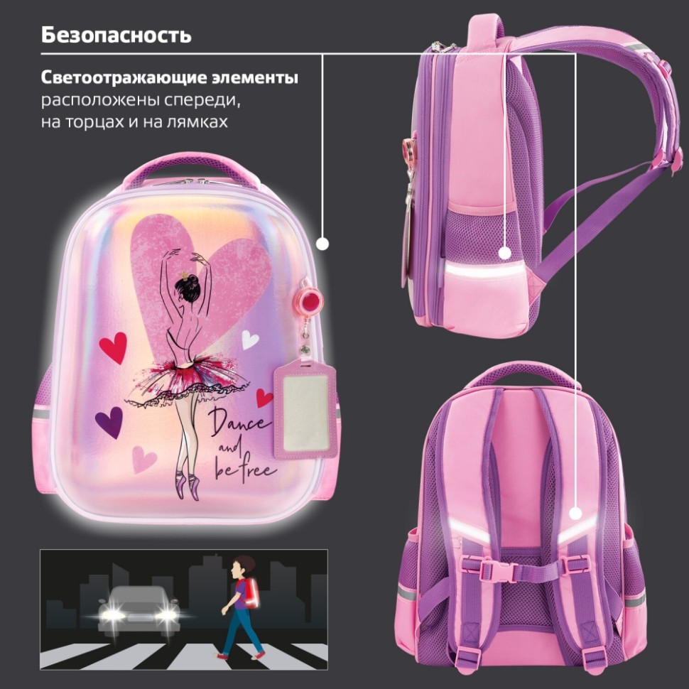 Серия LIGHT - ранцы с 2 отделениями, фронтальной панелью EVA и мягкими боковинами, что снижает вес изделия. Серия ранцев предназначена для учеников 7-11 лет. Ранцы имеют эргономичную вентилируемую спинку и фиксирующий нагрудный ремешок. Бейдж в комплекте. Ранцы ЮНЛАНДИЯ LIGHT протестированы НИИ гигиены и охраны здоровья детей и подростков ФГАУ "Национальный медицинский исследовательский центр здоровья детей". В рамках проведенных исследований* было установлено, что конструкции и материалы ученических ранцев соответствуют современным эргономическим требованиям и способствуют формированию здоровой осанки у школьников.Передняя панель ранца выполнена из гладкой экокожи с завораживающим перламутровым эффектом! Боковые панели ранца покрыты высококачественной влагоотталкивающей нейлоновой тканью с приятной шелковистой поверхностью. Ткань легко чистится и красиво блестит на солнце.Регулируемые по длине S-образные лямки можно оптимально подогнать под комплекцию ребенка, чтобы ранец носился с комфортом, несмотря на зачастую избыточный вес содержимого: учебников, тетрадей, канцтоваров. Регулируемый в двух направлениях нагрудный ремешок с фиксатором-защелкой поможет правильно распределить нагрузку. При правильной регулировке ранец будет практически не ощущаться на плечах и не будет доставлять дискомфорт при носке. Удобная мягкая вентилируемая спинка с воздушными спонжевыми панелями разработана с учетом анатомических особенностей детей младшего школьного возраста. В процессе эксплуатации конструкция ранца позволит сохранить правильную осанку!В основном отделении ранца можно легко и быстро разместить учебники и тетради между двумя плотными перегородками. Внутри фронтального отделения находится органайзер для канцтоваров, именная карточка, карман для телефона и большое отделение из сетки. Такая организация пространства поможет держать принадлежности в сохранности и приучить ребенка к порядку. Ранец широко раскрывается, повышая удобство использования, а за счёт боковых перегородок содержимое не выскользнет из ранца.Ранец легко открывать и закрывать одной рукой с любой стороны - каждое отделение имеет долговечную реверсивную молнию с двумя металлическими бегунками.В боковых карманах на резинке можно разместить бутылочку, термос или зонт. Нести ранец будет удобно не только на плечах, но и в руке за прочную уплотненную ручку. Светоотражающие элементы ранца расположены спереди, на торцах и на лямках. Они необходимы для безопасности пользователя в темное время суток.Имеются резиновые ножки для устойчивости и защиты от загрязнений.В комплекте с ранцем поставляется бейдж для пропуска на рулетке. Для его надёжной фиксации на одной из лямок ранца имеется специальное металлическое кольцо. Это очень удобно и экономит массу времени - ребенок просто прикладывает пропуск к турникету, вытягивая его на нужное расстояние, а затем рулетка автоматически возвращается обратно. Пропуск всегда под рукой!Ранец поставляется с надутой воздушной подушкой, которая помогает транспортировать изделие сохраняя товарный вид.Яркая этикетка расположена на передней стороне ранца, делая его более заметным на полке магазина, а информация в ней отражает главные потребительские свойства, помогая покупателю принять решение о покупке.Ранец уп