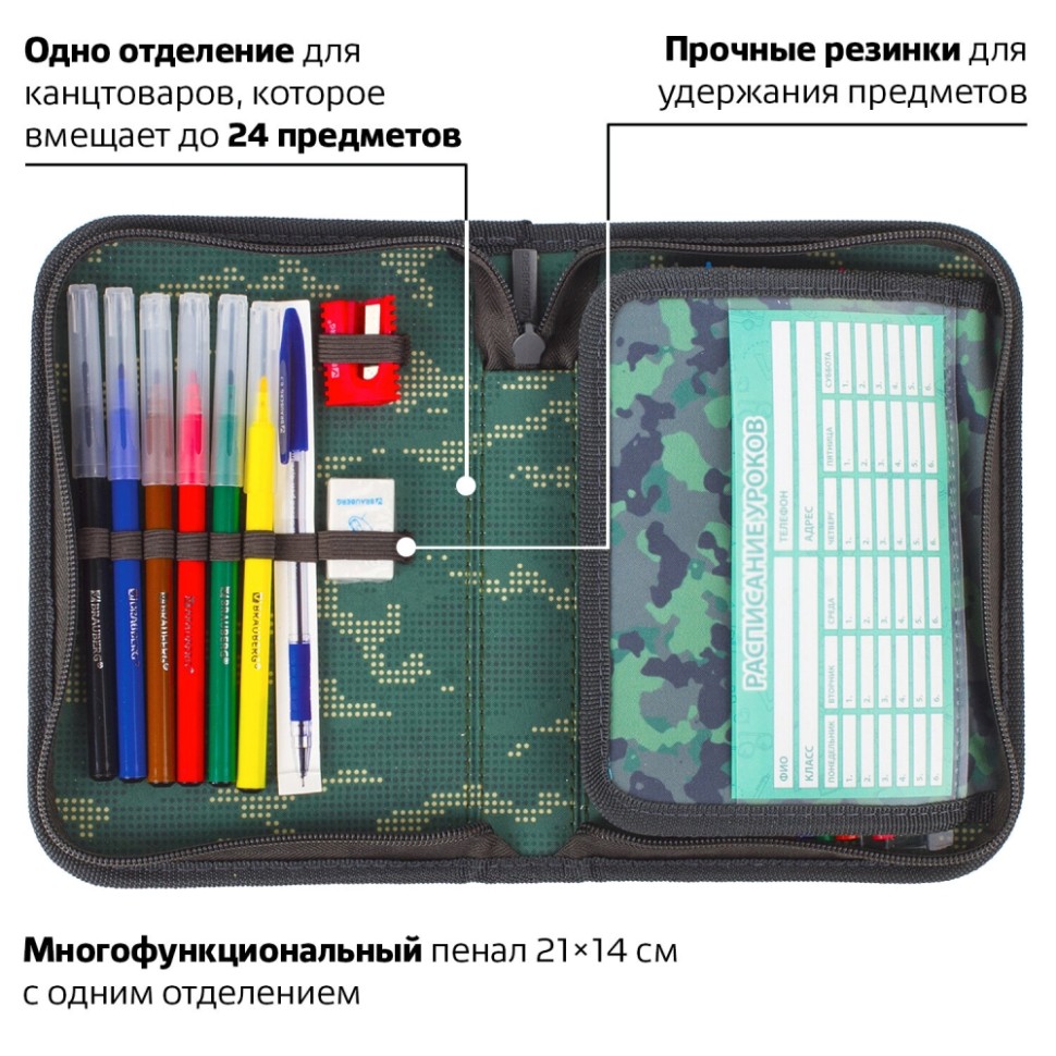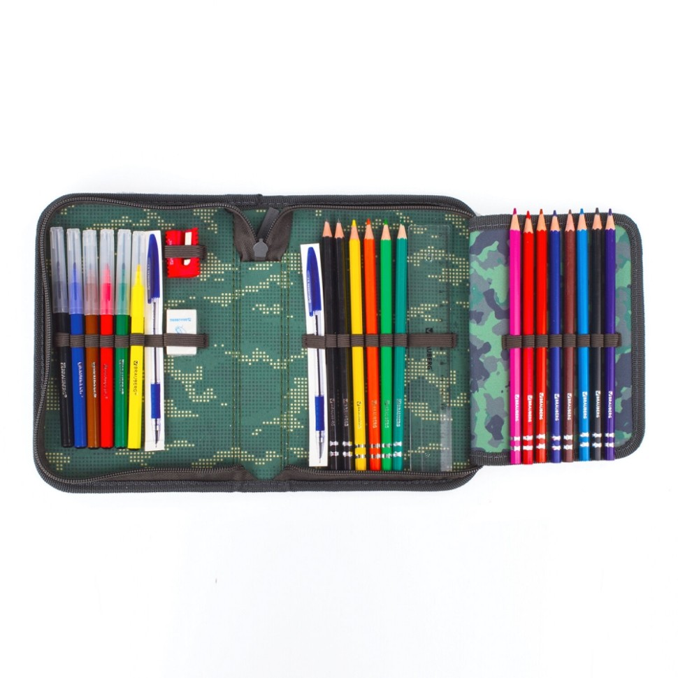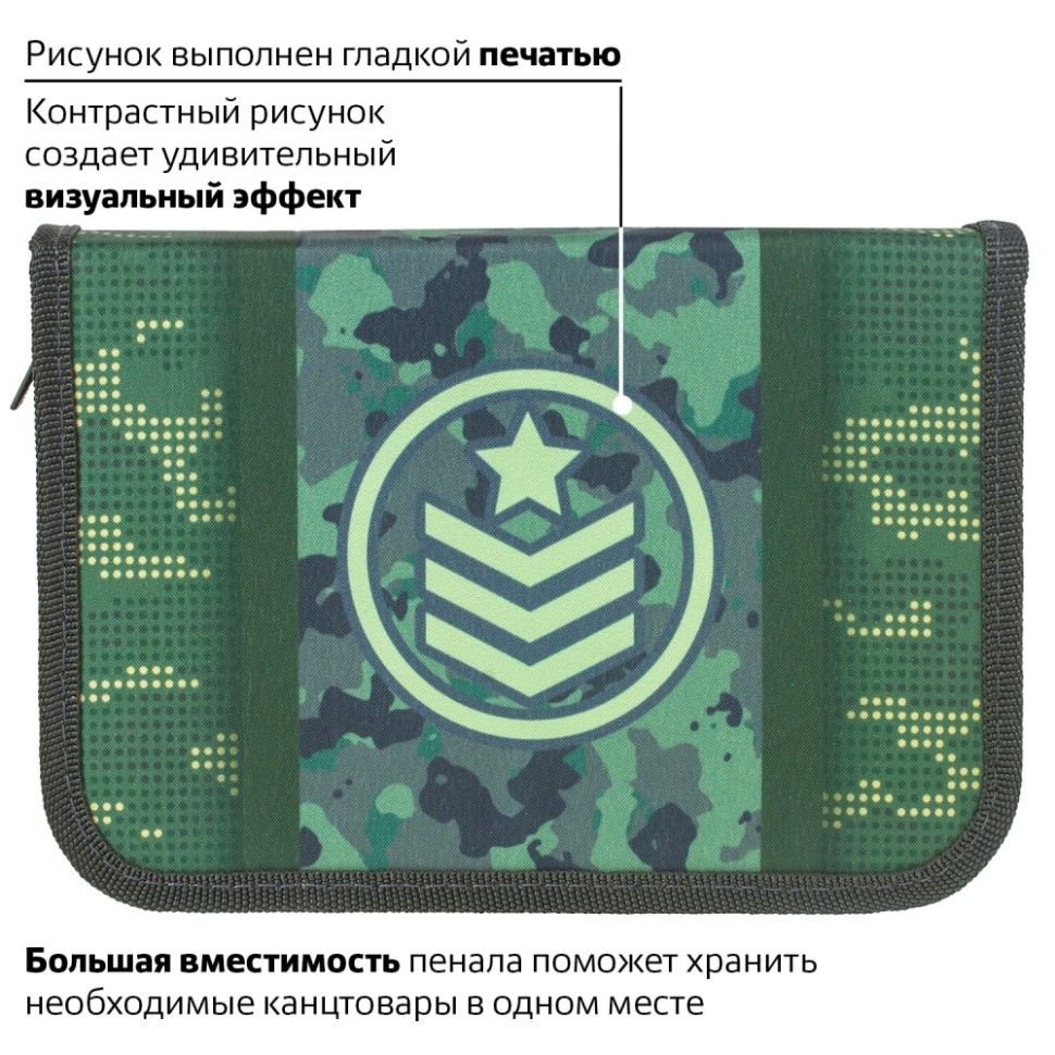 Пенал с наполнением BRAUBERG, 1 отделение, откидная планка, 24 предмета, 21х14 см, "Army", 229294 (229294)