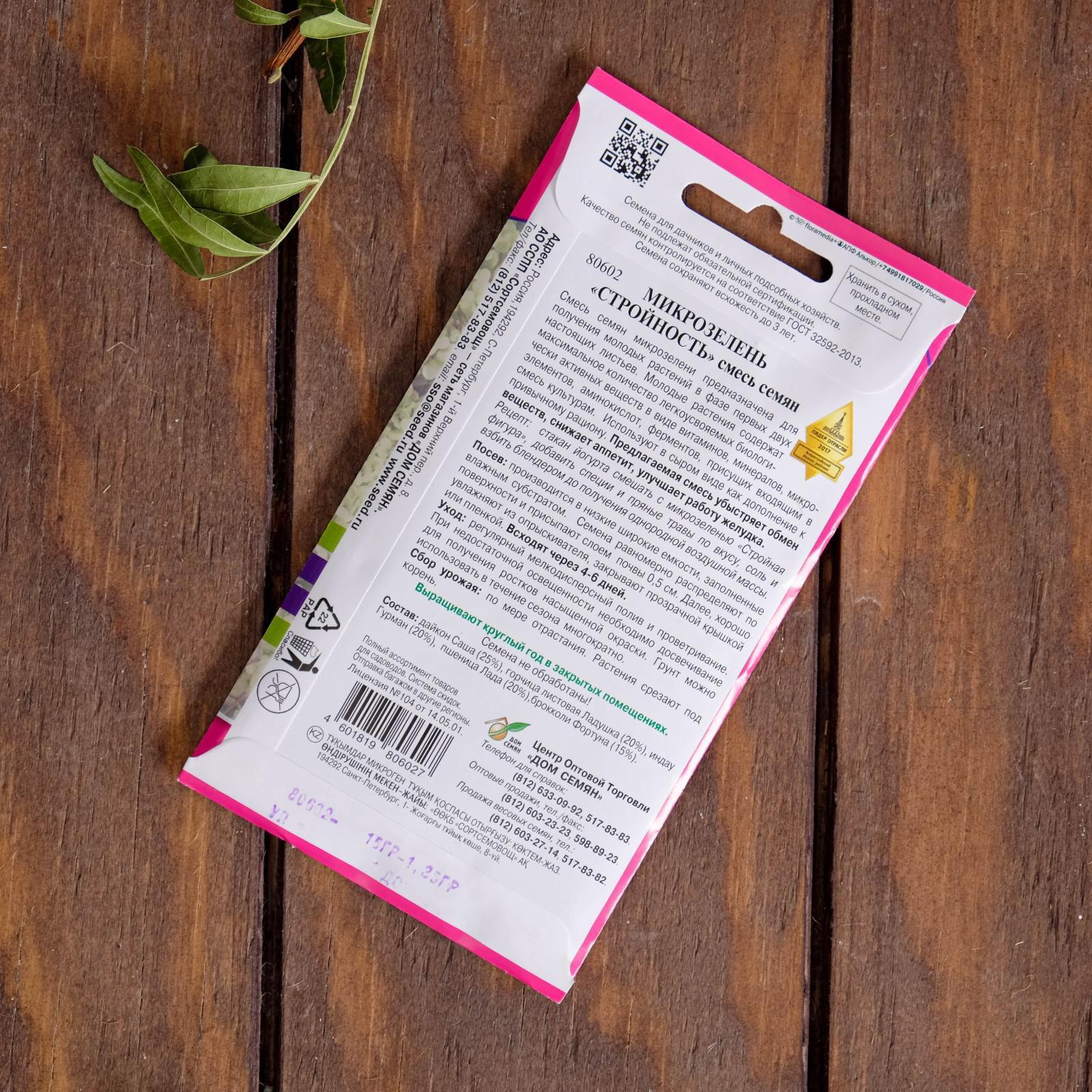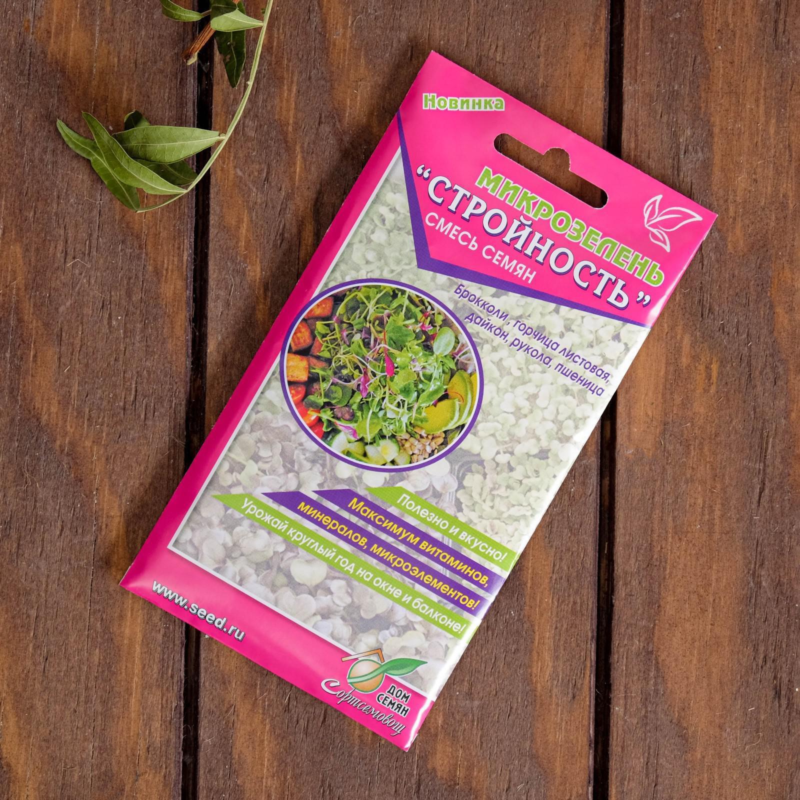 Состав: дайкон Саша (25%), горчица листовая Ладушка (20%), индау Гурман (20%), пшеница Лада (20%), брокколи Фортуна (15%).